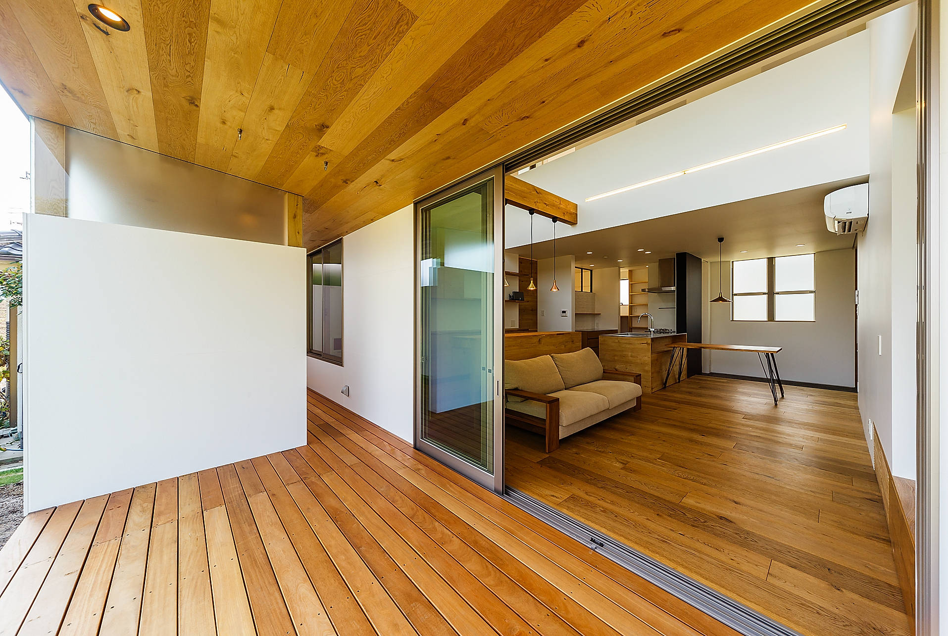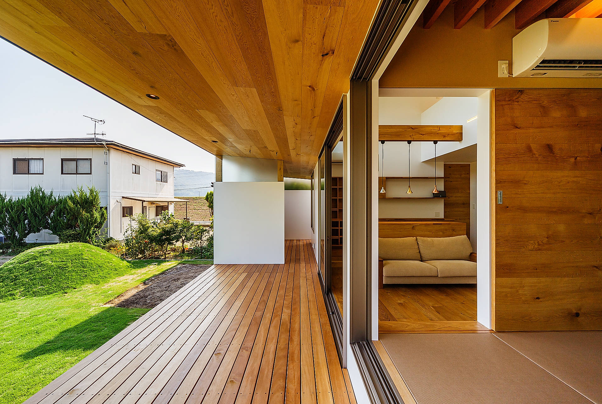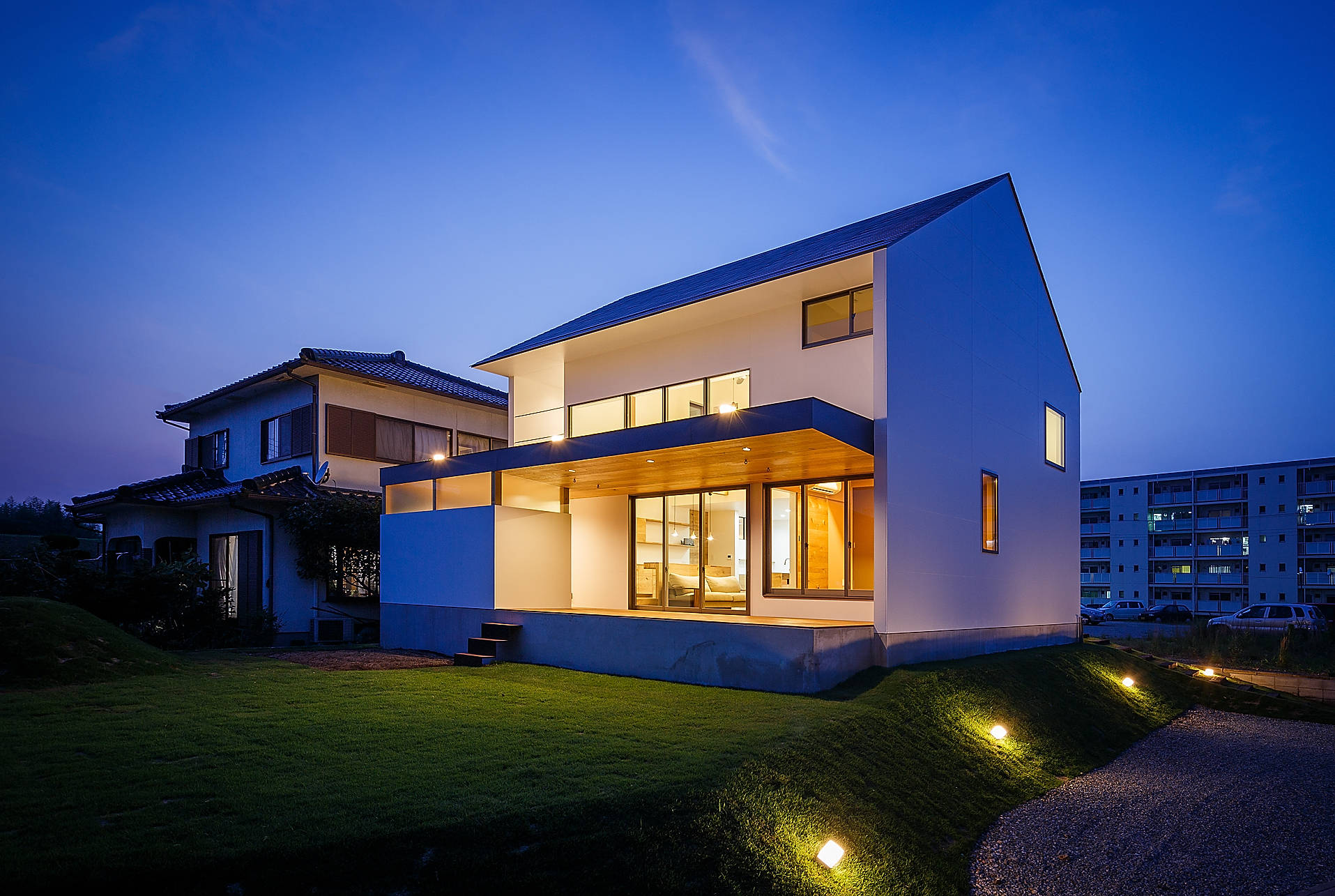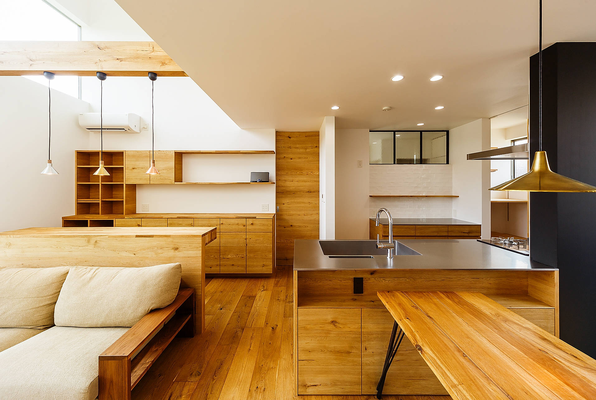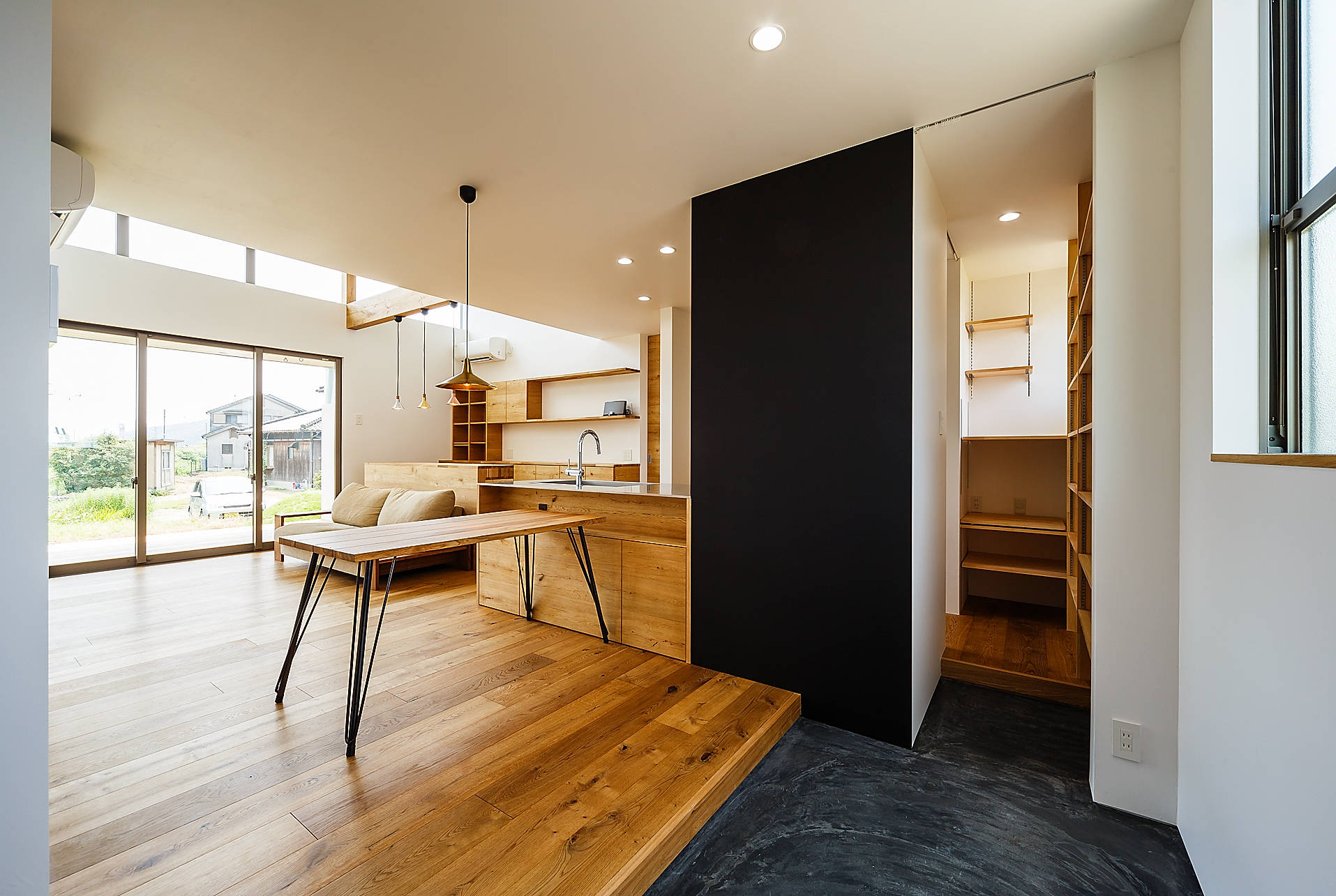 敷地は河川と鉄道沿線の間にあり、地縁者しか戸建て住宅を建てられない市街化調整区域。 草原ような周辺環境と広大な景色が広がる敷地は気持ちいい風が流れます。 ここに建主自ら計画されたプランを煮詰めて、可愛らしく、お家らしい形にまとめました。周囲と同化するような草屋根を眺められる2階スタディスペースではリビングの家族とともに風を感じながら健やかに過ごせることでしょう。また内部では節ありのナラ材や真鍮のペンダントライト、黒板の壁、レトロなガラスを使用するなど、とても味わい深い住宅となっています。