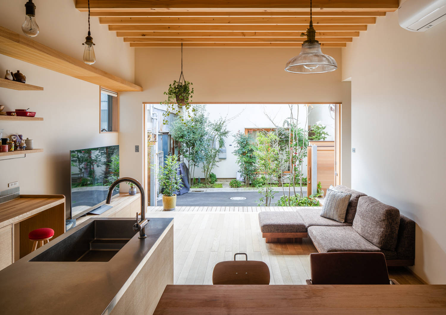 敷地には2面の道路があり,特に南側はすれ違うのもやっとな細い路地に面しています.本計画では住宅を路地に向かって大きく開き,向かい側の住宅の道路後退と併せてそこに小さな公園のような領域を作り,街にひらかれた風通しの良い住宅としています.