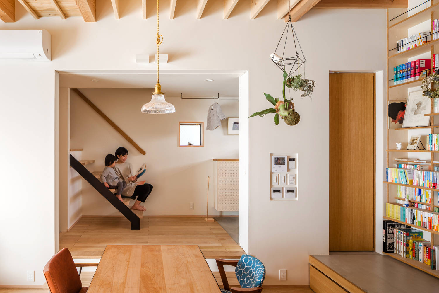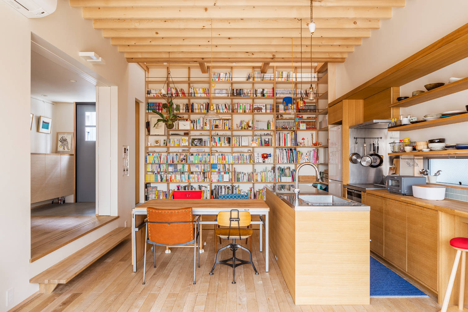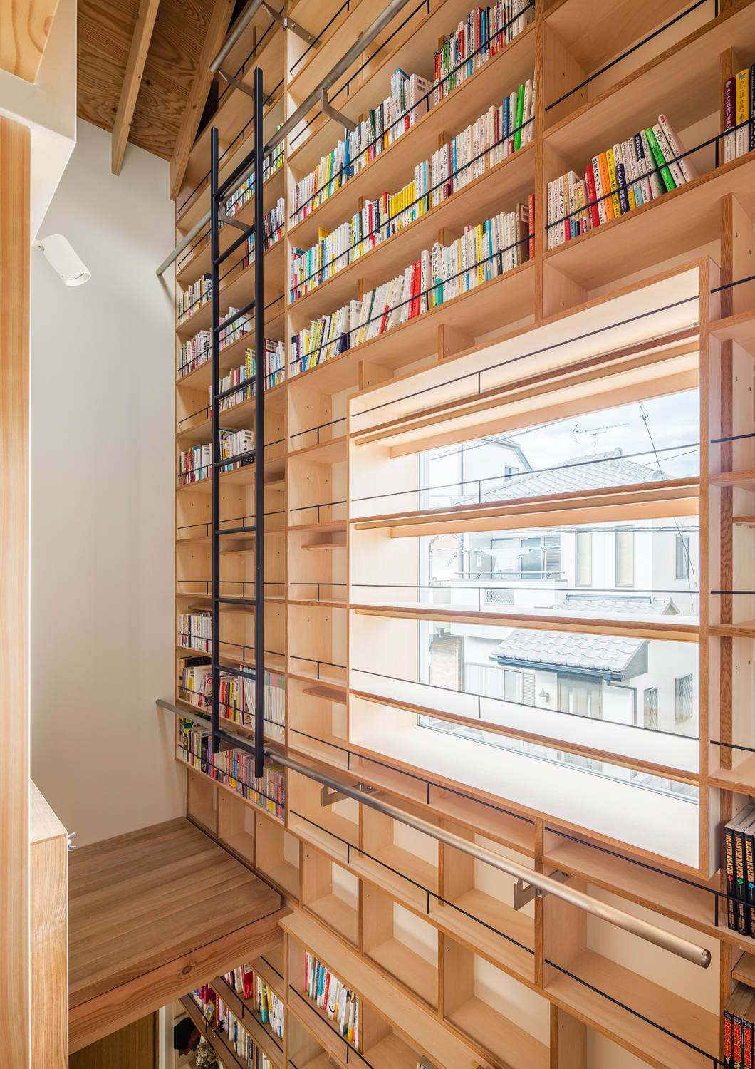 室内は1階でありながら3.2mの天井高を確保し,装丁家であるクライアントの所有する膨大な量の書籍のために,ロフトにまで達する三層吹き抜けの本棚を設けました.本棚は安全かつ機能的に利用できるよう,可動式の床パネルを含め,様々な工夫を随所に凝らし製作されています.