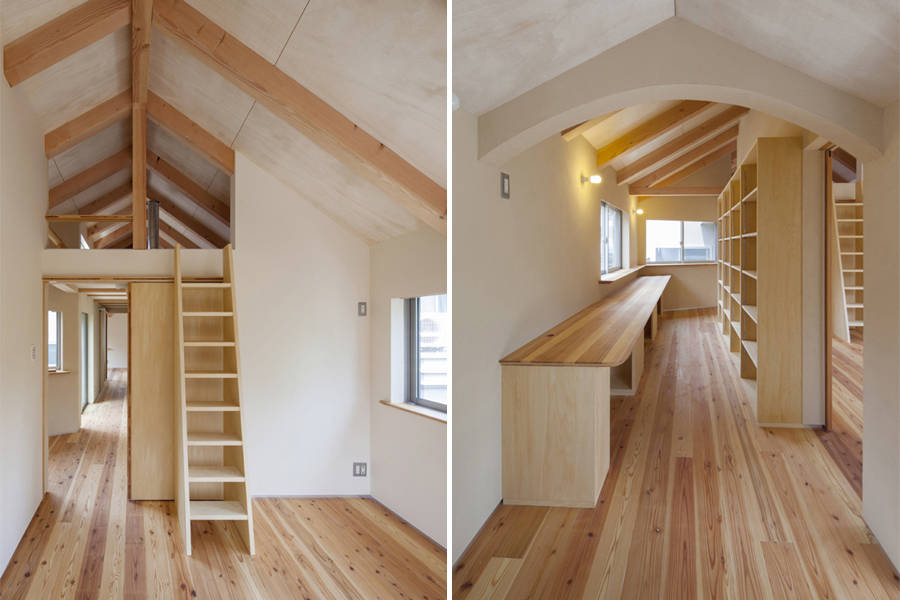 特にめいっぱい天井高を取った2階は、ロフトやテラスへと繋がり、開放的でたっぷり光が入り、心地よい風が抜け、借景が楽しめる、気持ちのよい空間となりました。