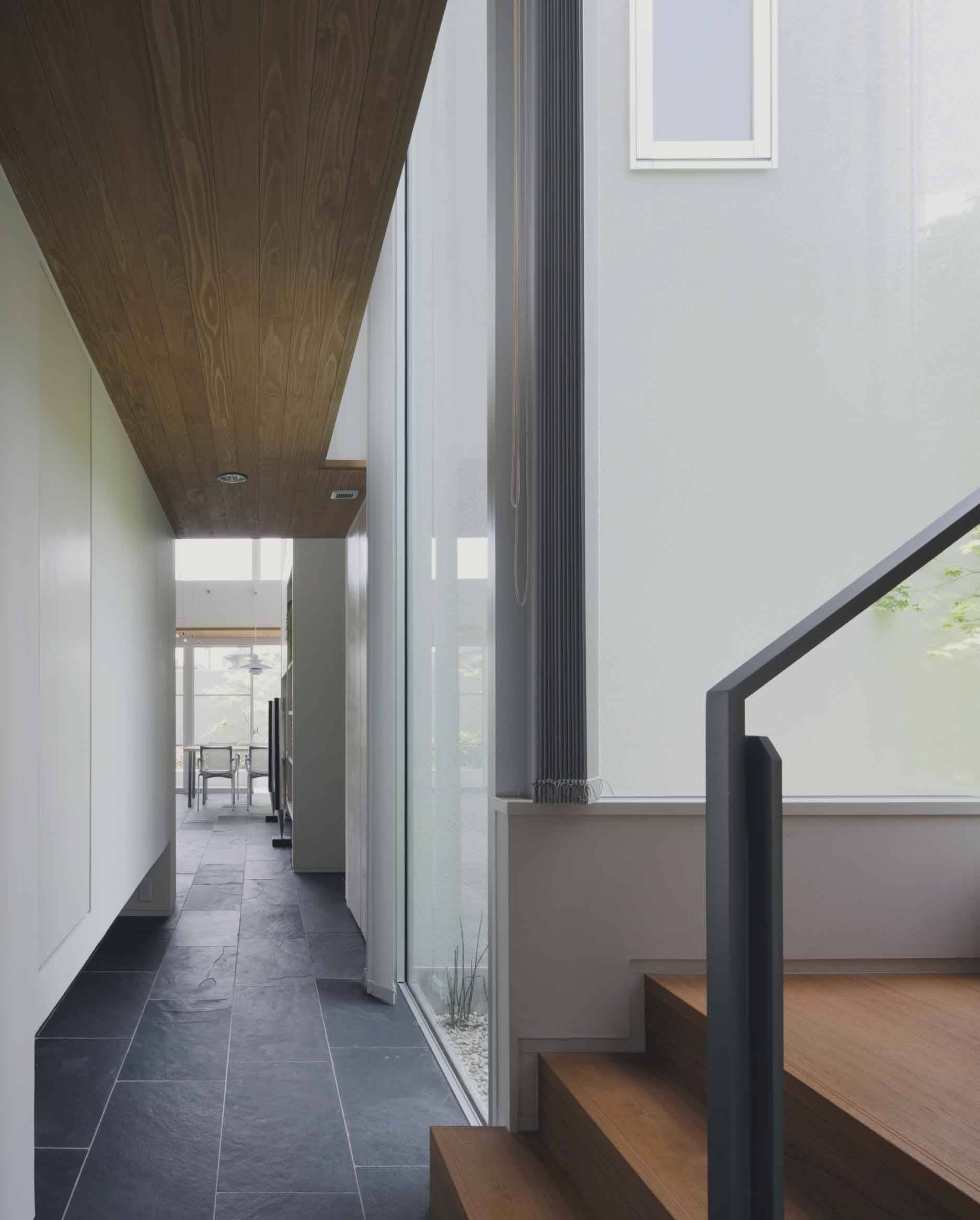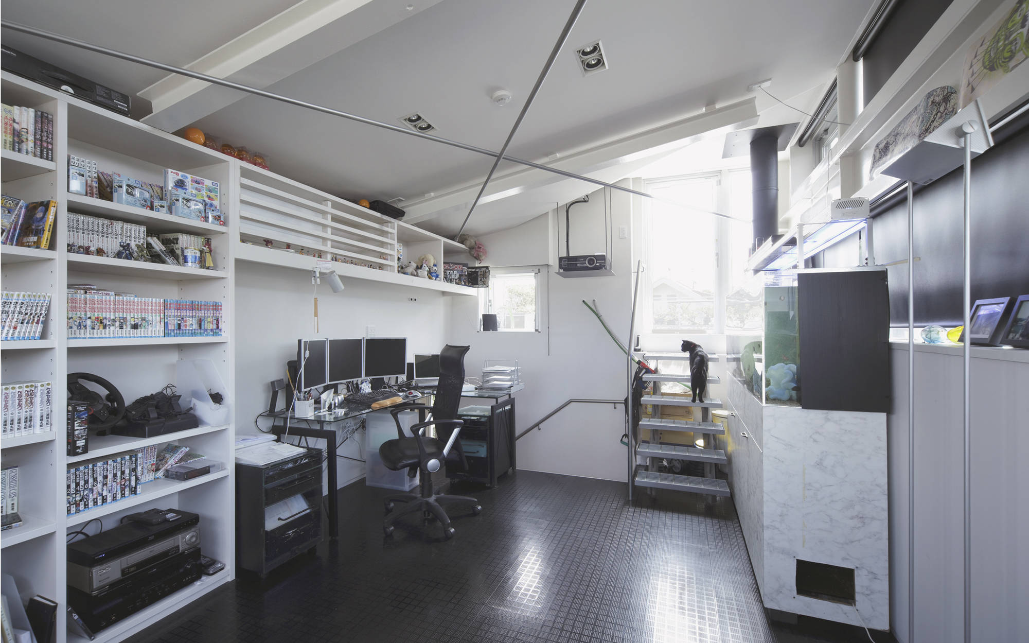 オウム、ネコ2匹、熱帯魚と多彩なペットと共に趣味人の若夫婦が暮らします。吹き抜けのある約32帖のリビングダイニングキッチンは、和室の引戸を開けると約40帖の一体空間となっていまる。玄関ホールからのブラックスレート敷きの床は、リビングダイニングキッチンそしてその先の「にわ」にまで続きます。リビングルームの窓はフルオープンで開き、「にわ」は第2のリビングルームとなります。冬はストーブを囲みながら、そして夏は「にわ」にまで開放した大きなリビングルームにてパーティーなどの社交がふんだんになされます。屋上バルコニーにはパーゴラがあり、主人の趣味部屋からすぐに出られるアメニティに満ちた空間となっています。