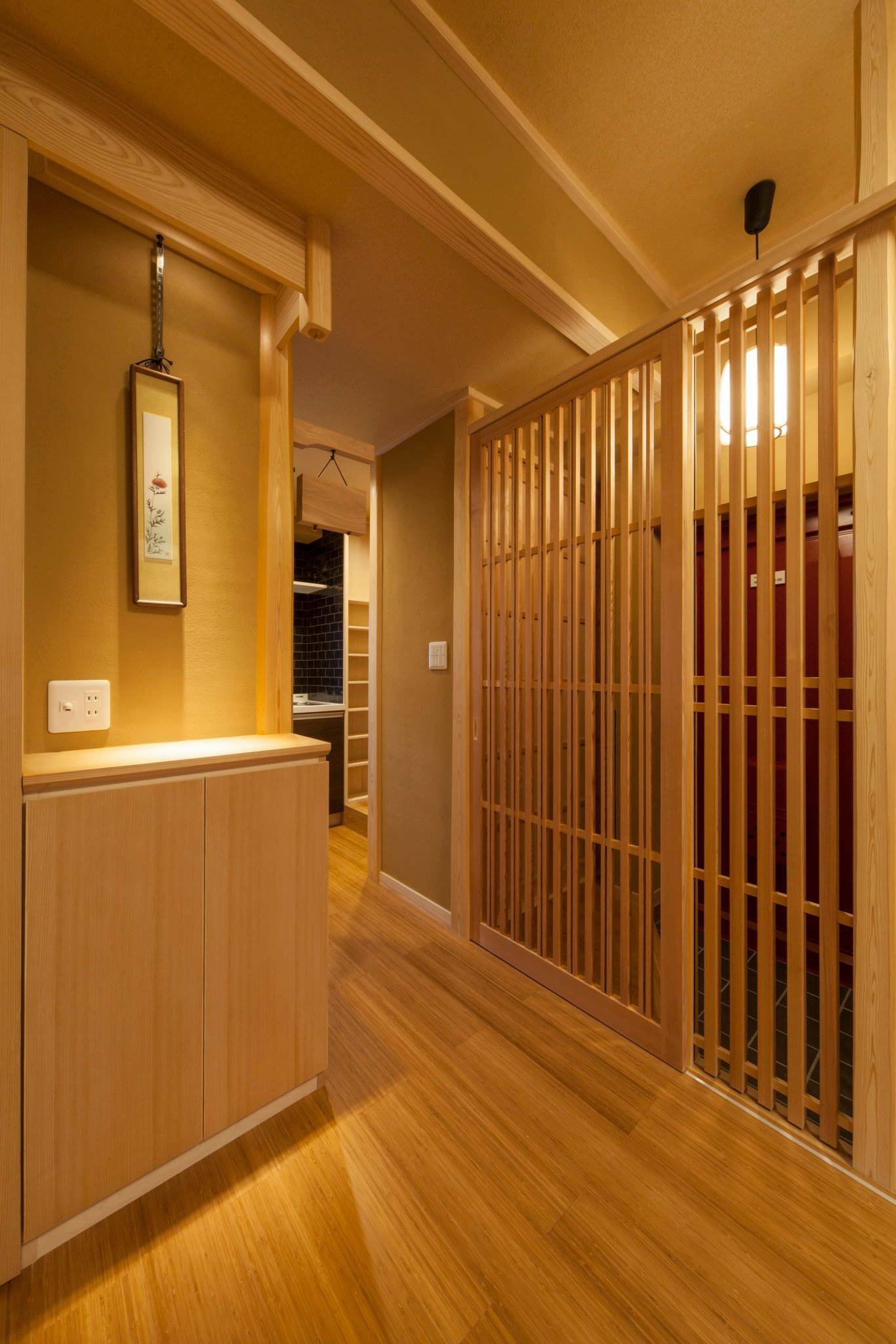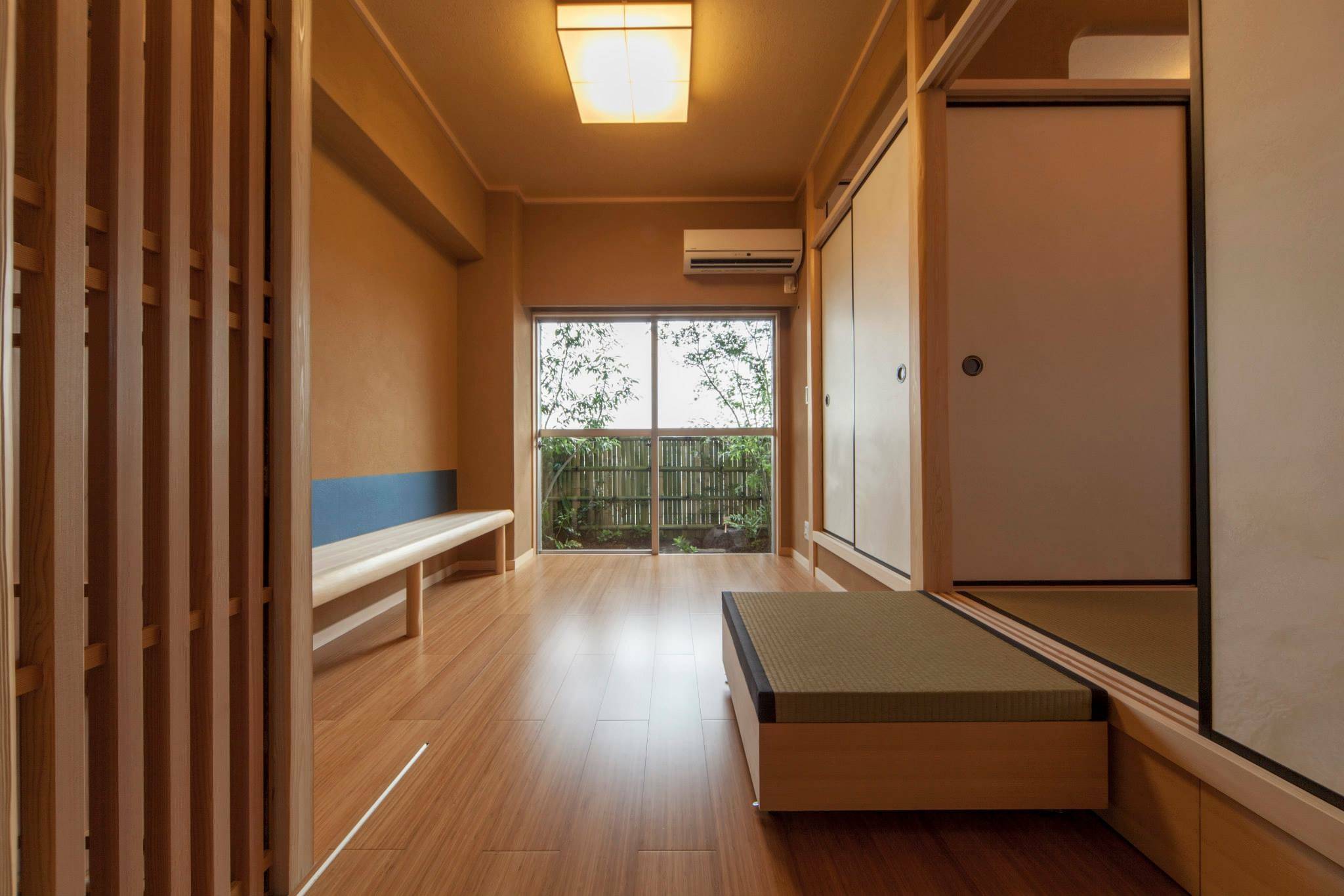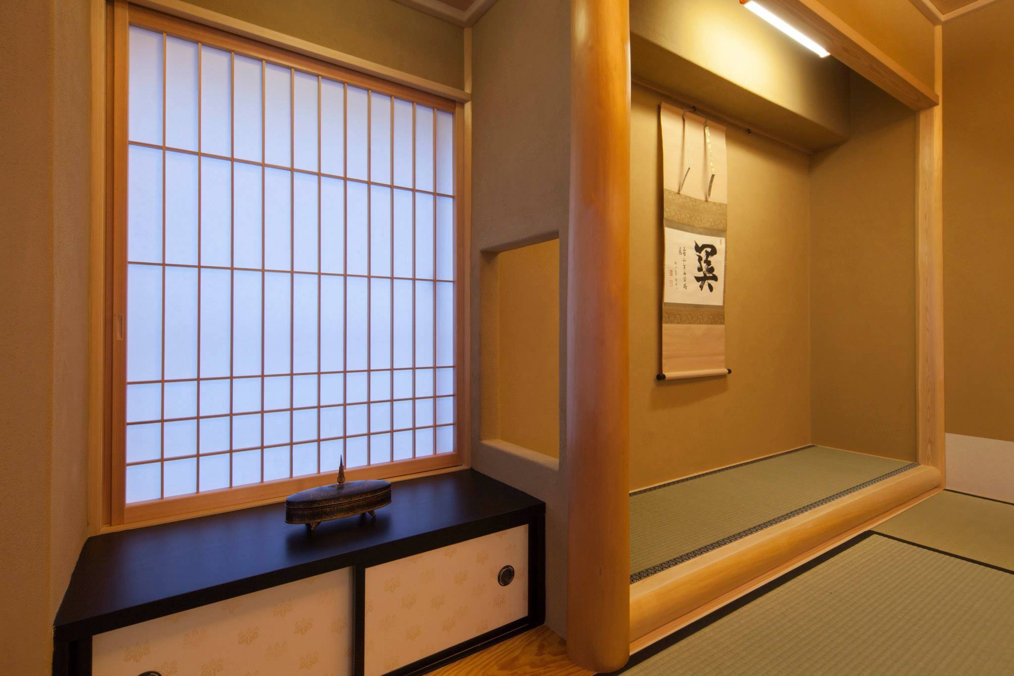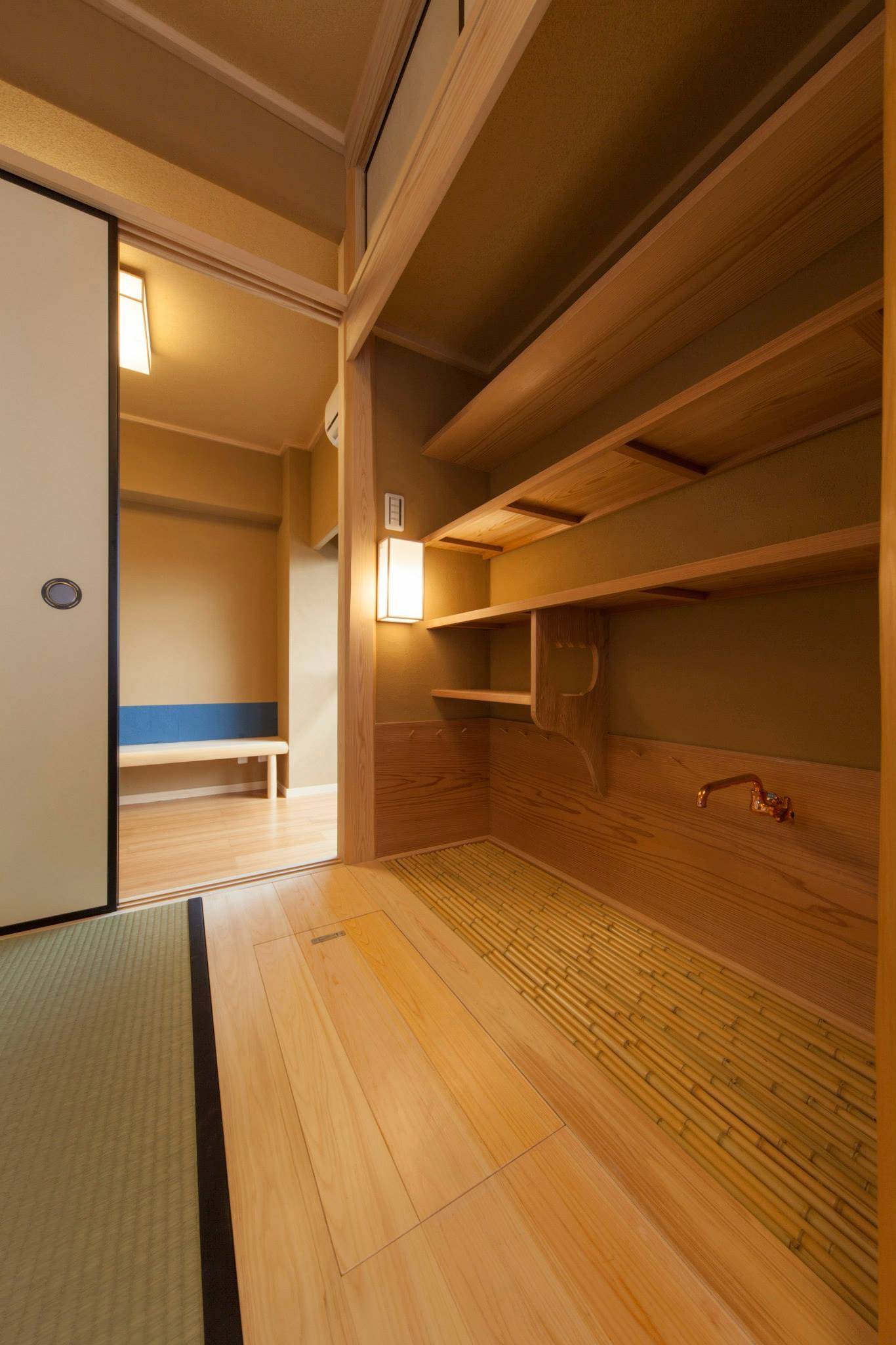 築40年のマンションの一室を茶室に改装。狭いながらも茶事ができるように露地、待合、台所まで付けた本格的8畳広間と水屋からなる茶室空間。