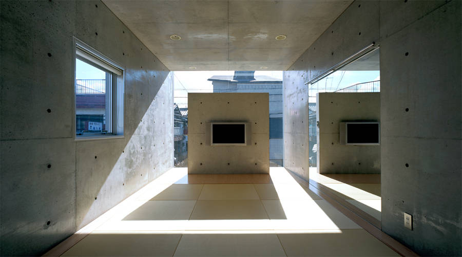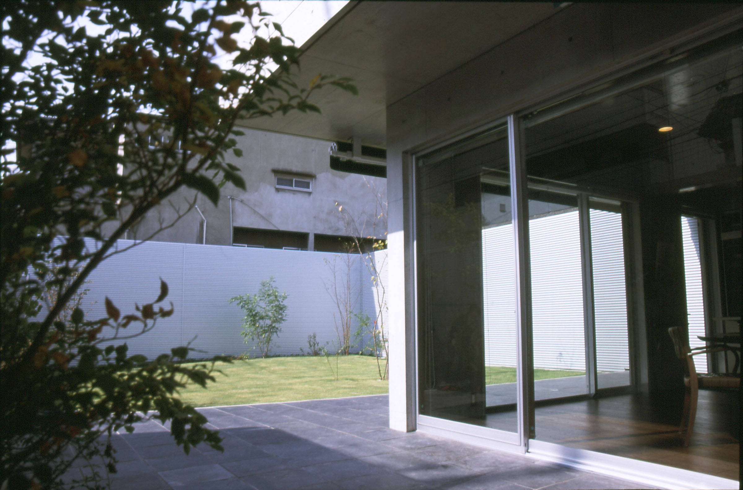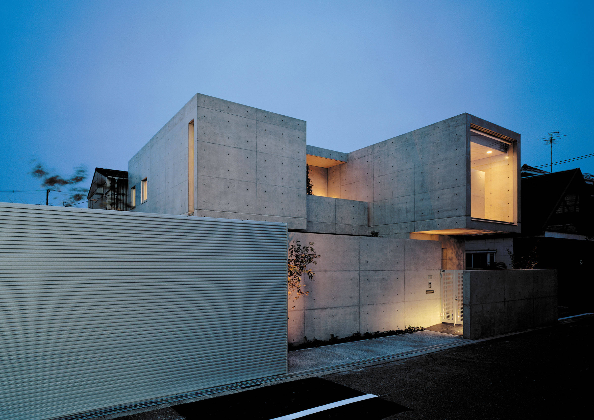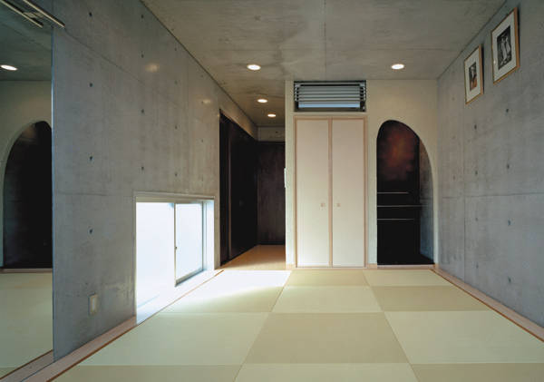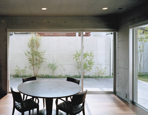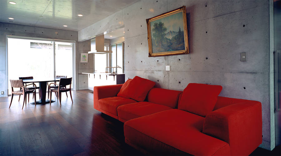 クライアントの要望は内外ともRC打放しの家。長所、短所をよく話し合った結果、北側は断熱材と仕上を施し、南側の主たる空間は打放しとした。庭、中庭、アプローチ等の外部と、内部の空間は躯体のずれが生む中間領域によって結びつけられている。RC壁式構造の躯体を美しさへ高めるのは“贅肉の無い造形”。取り除けるものは徹底的に排除する。その姿勢において妥協しない事を課した。それが品のある建築に繋がると考えた。
