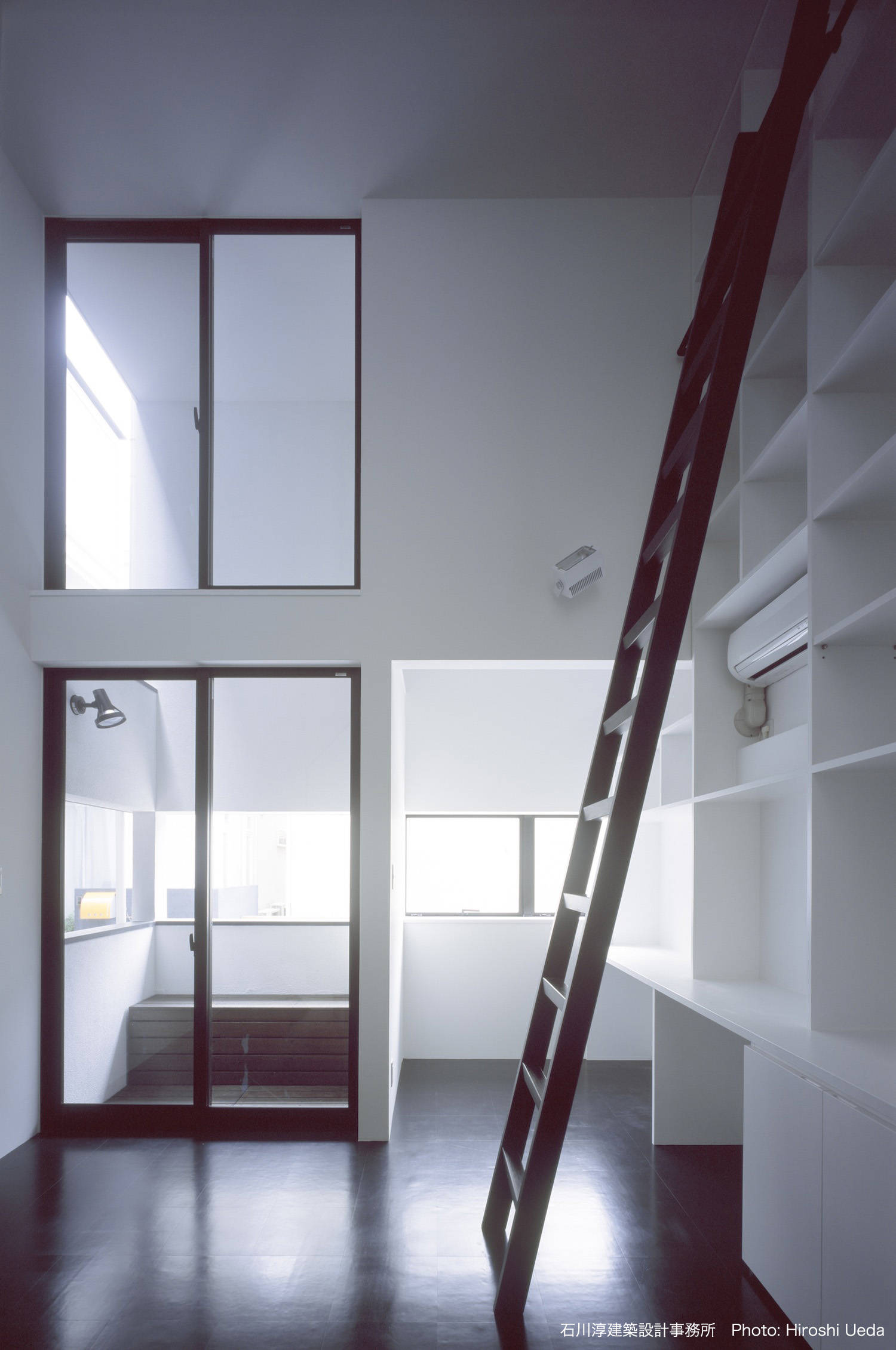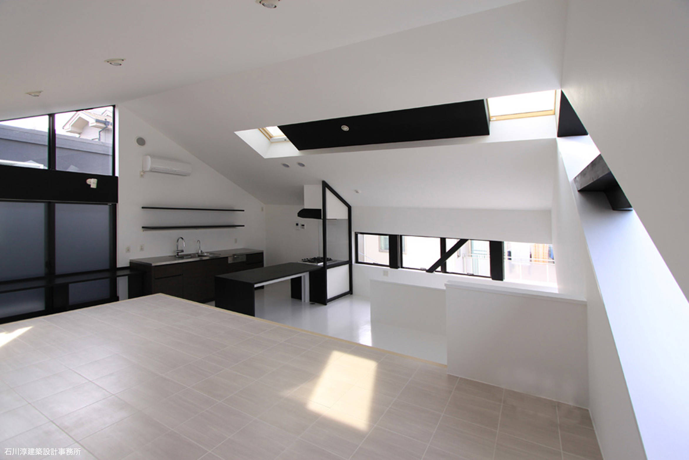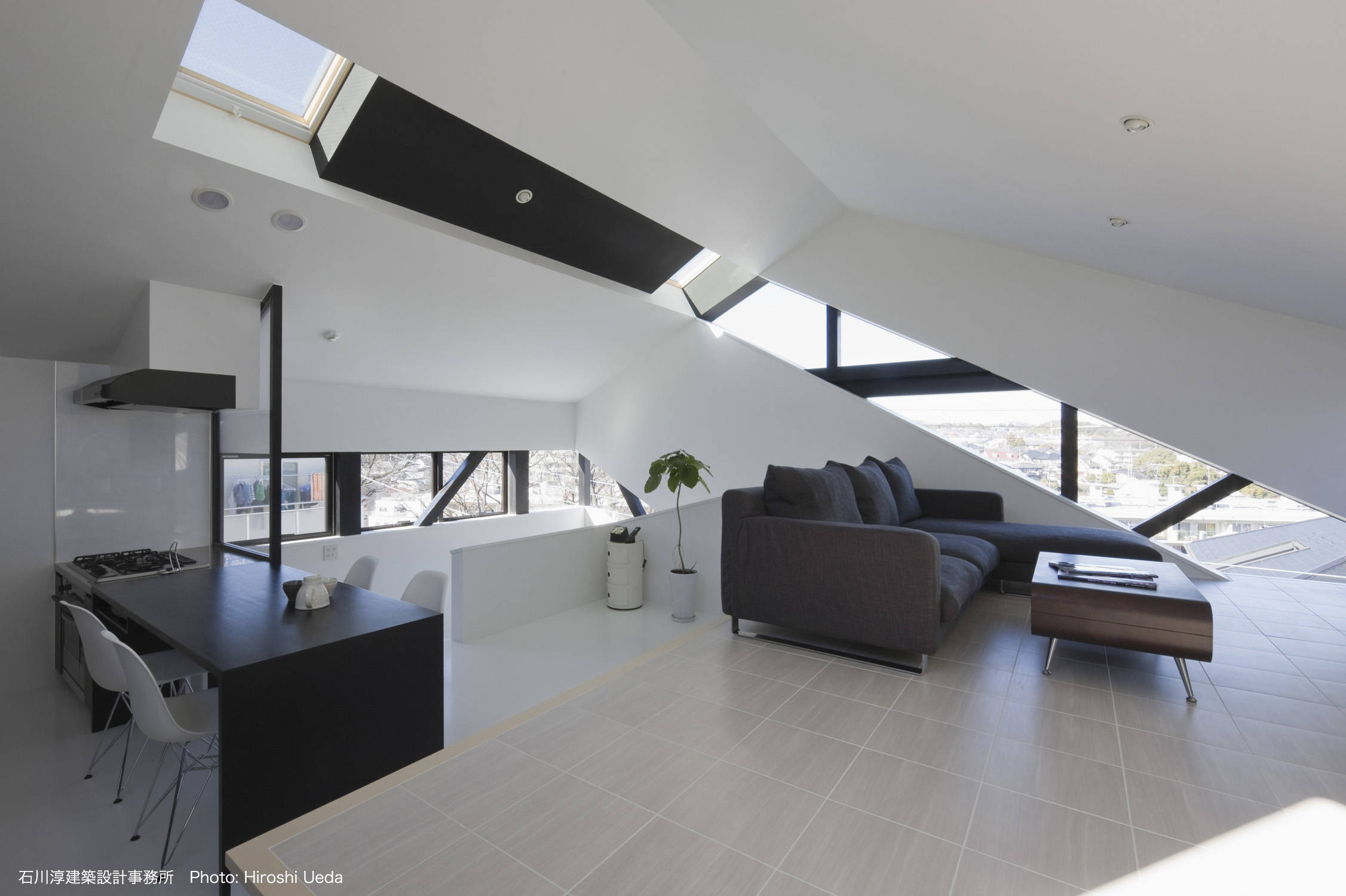 敷地は北斜面の造成地で、丘陵地の一角にあります。近隣には公園の桜があり、遠方には遊園地の観覧車も見る事ができる景色の良い場所です。眺望の良い最上階にリビングダイニングを配置。そこからの眺めを楽しむ事ができ、外部からはプライバシーを守るため、窓を細長くし、さらに斜めに取りつけることにしました。これにより、部屋の足元には谷間の方向、目線の先には公園の桜、上方には青空と、多くの眺望を獲得することができました。