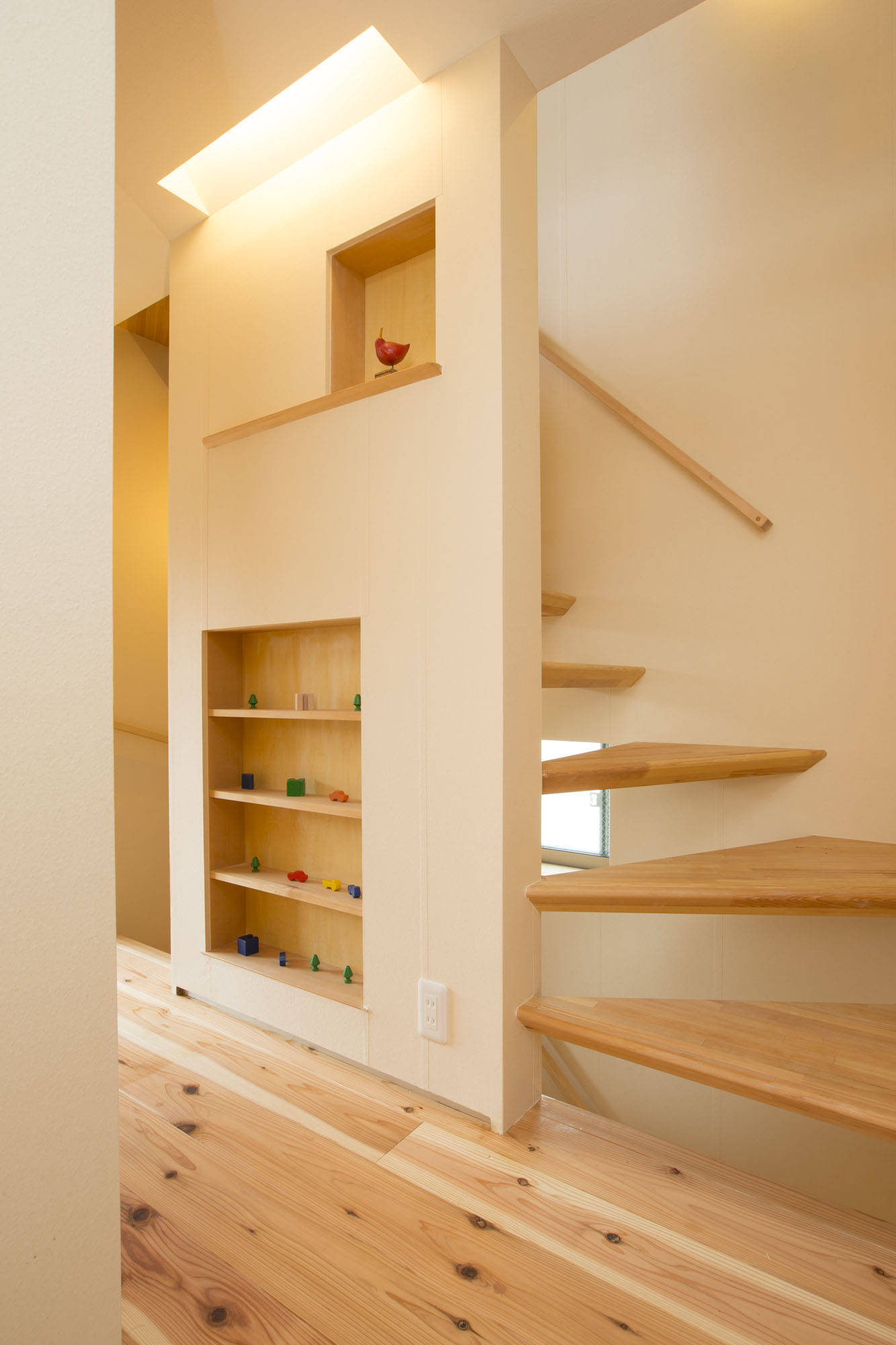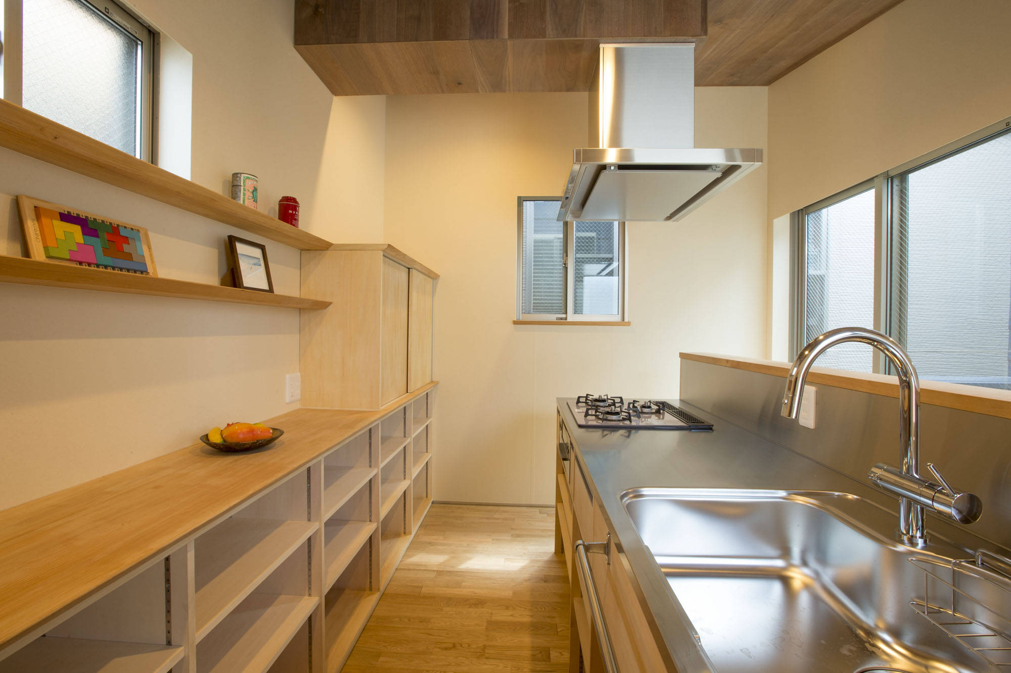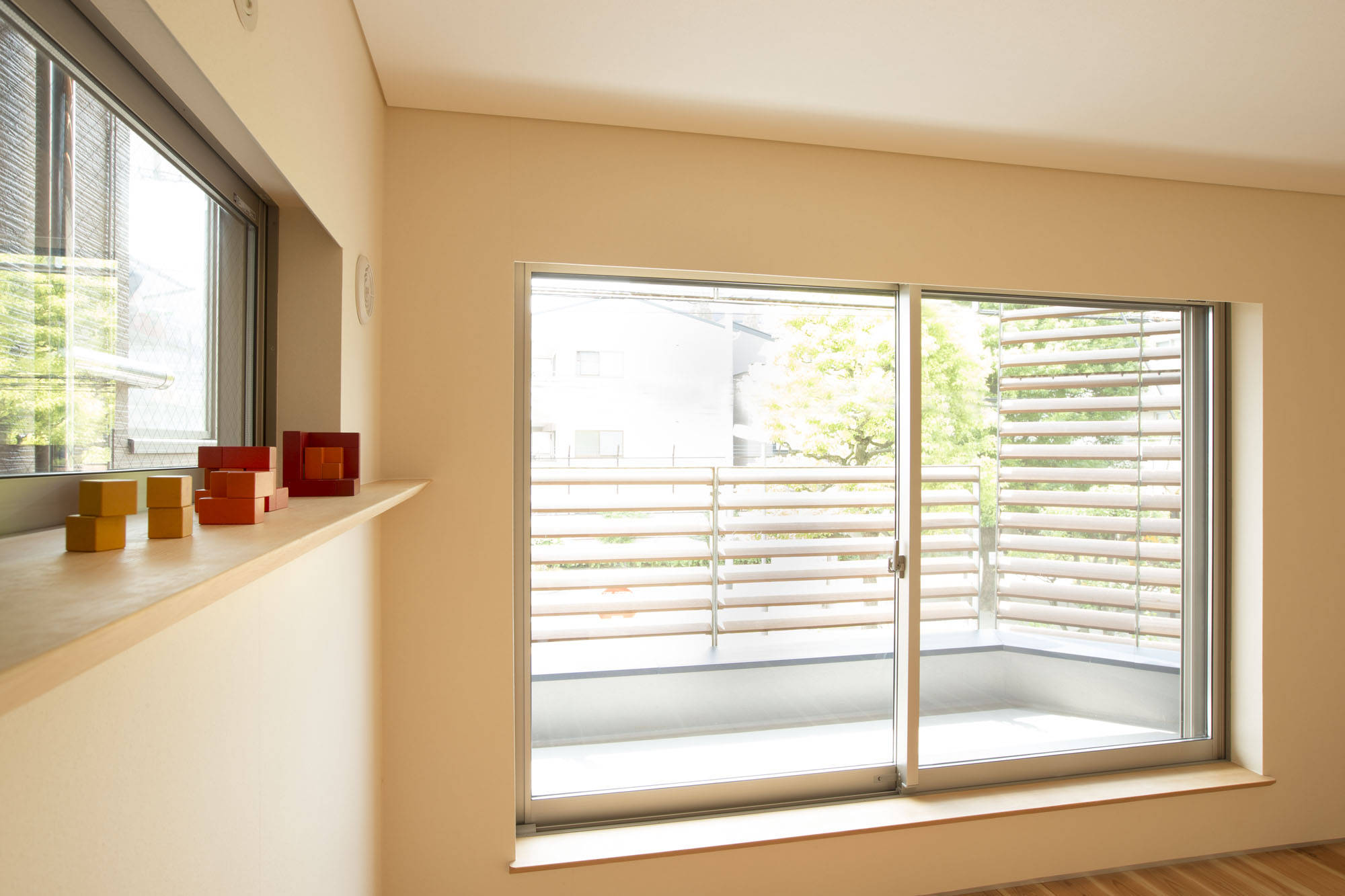 小さくても外部空間を室内に取込み広がりある住まい。公園の借景やテラスから室内に取り込んだ採光や通風、また無垢板や和紙など自然素材の心地良い住まいとしています。