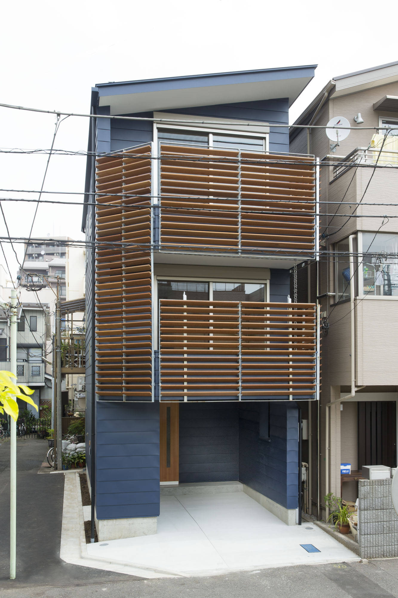 細長い狭小敷地に建つ、家族4人のための木造3階建ての住まいです。