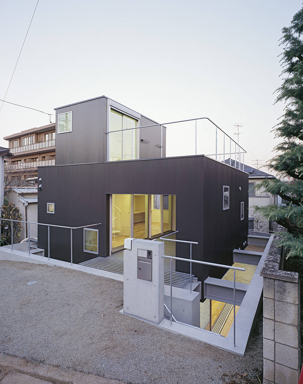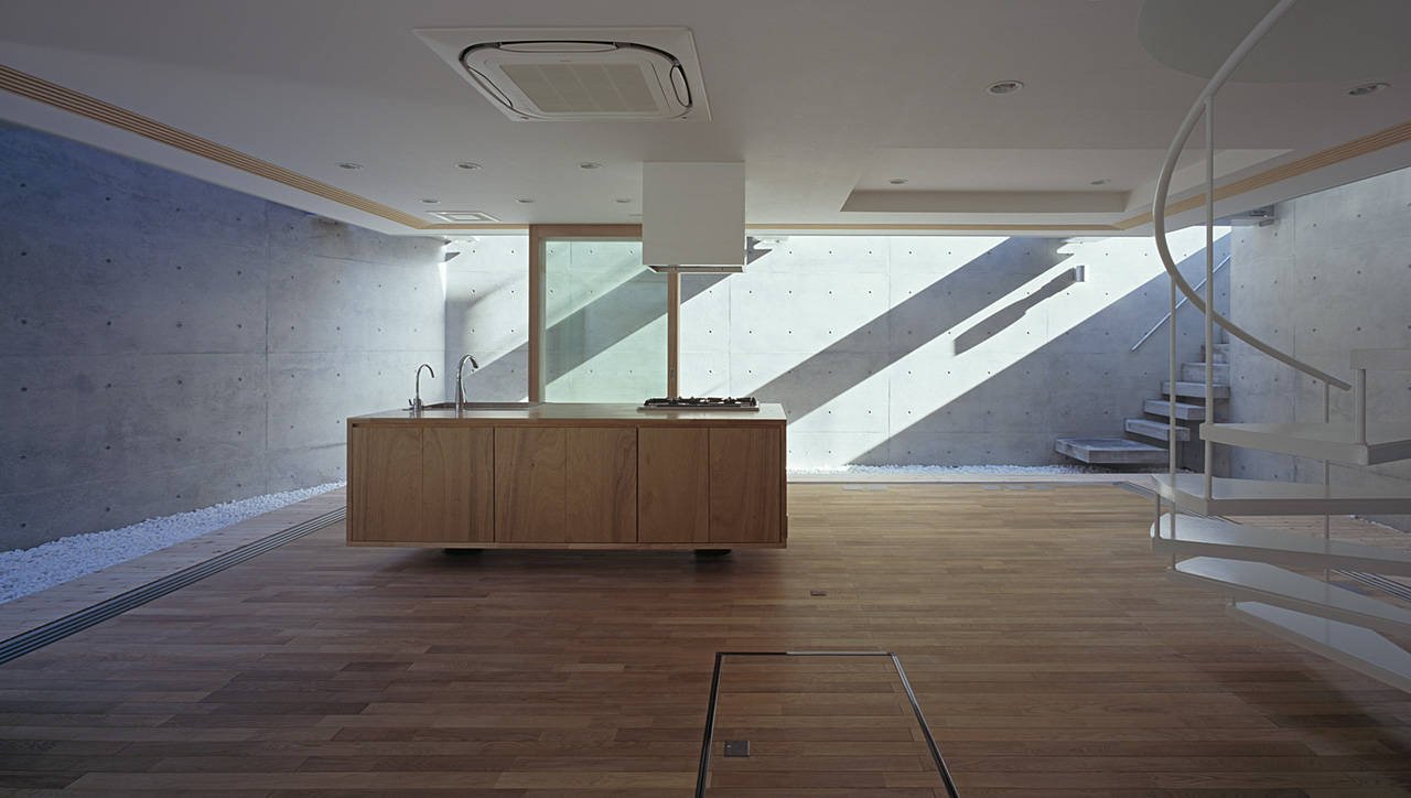 窪んだ土地を購入されたクライアントは、当初土地を埋めることも検討していましたが、窪地を活かすために透明のキッチンスペースを設けることを提案しました。