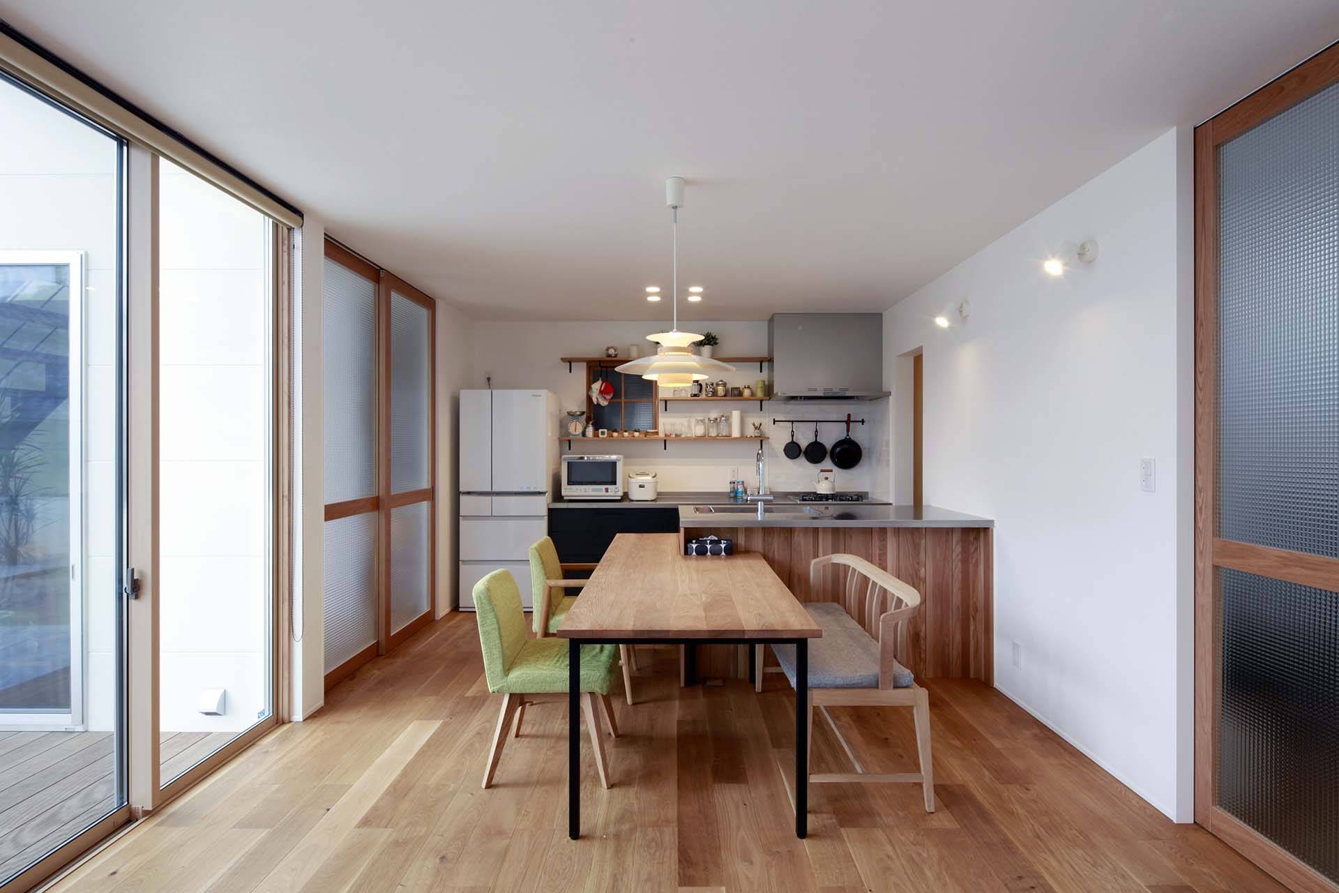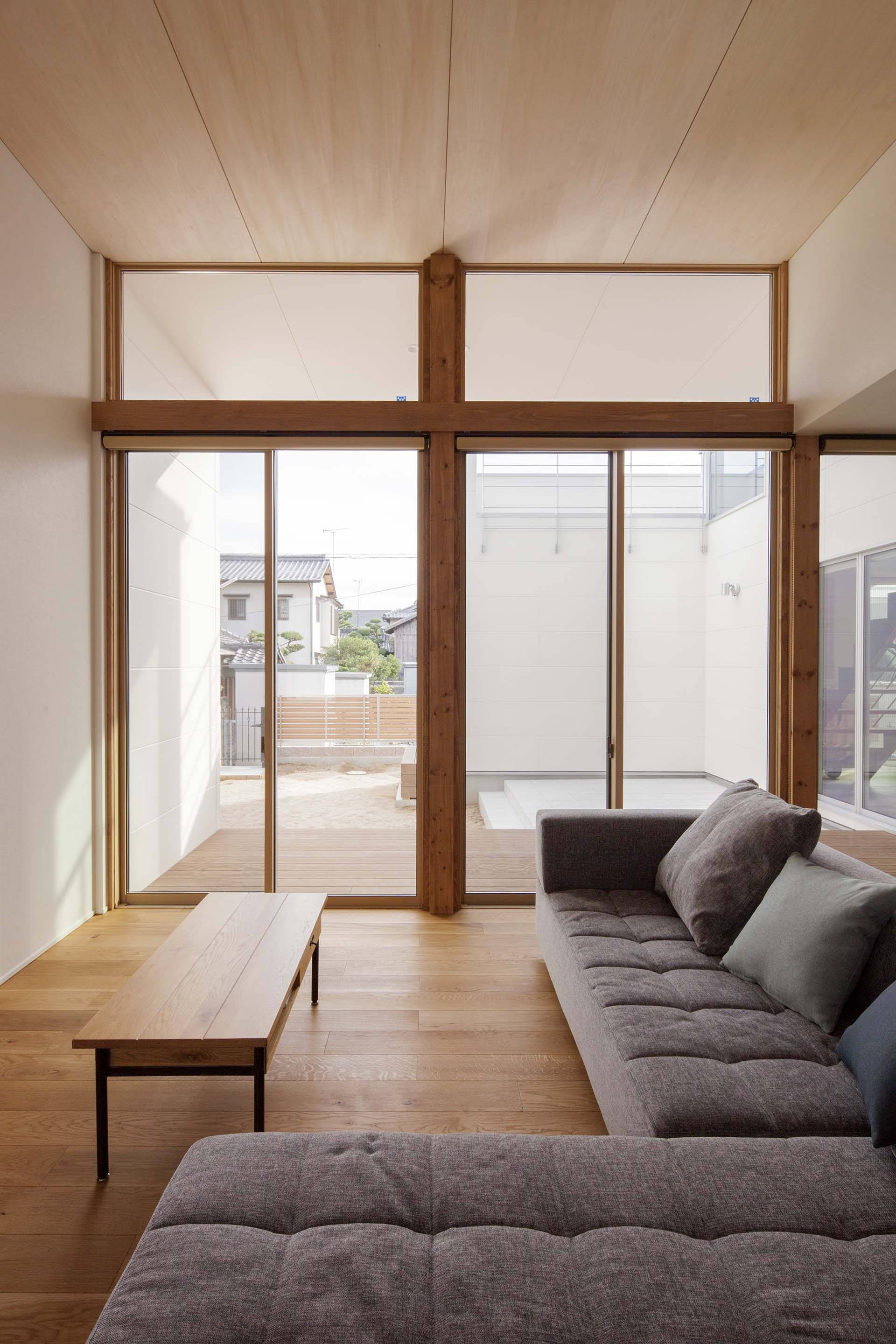 リビングは光が奥まで届くように天井を高くして、床から天井までの大開口としています。そして、冬の陽光は取り込み、夏の日射は遮ることができる深さの軒を設けました。大きな開口のため軒も高くて深いものになり、普通の軒下より屋外のように感じられる明るい空間です。