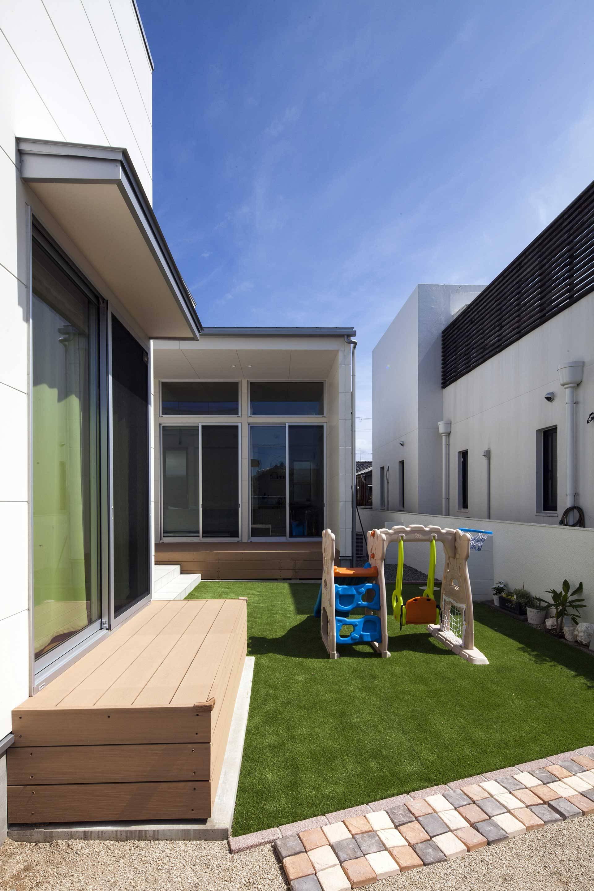 ウッドデッキで仕上げられた軒下を、先日も子供たちが走り回っていたそうです。すこし深めに確保した軒が日々の生活に彩りを 与えはじめてくれているようです。