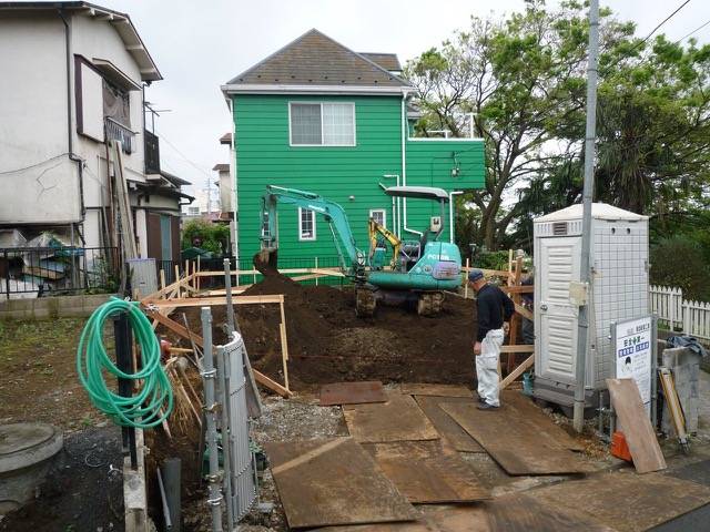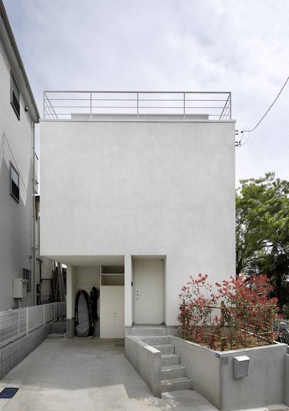 横浜の丘陵地帯に建つ3階建ての小住宅。前面道路は勾配があり4m以下の幅員、不整形な狭い敷地だが、西側が斜面となっていて見晴らしがいい。敷地条件としては特殊である。