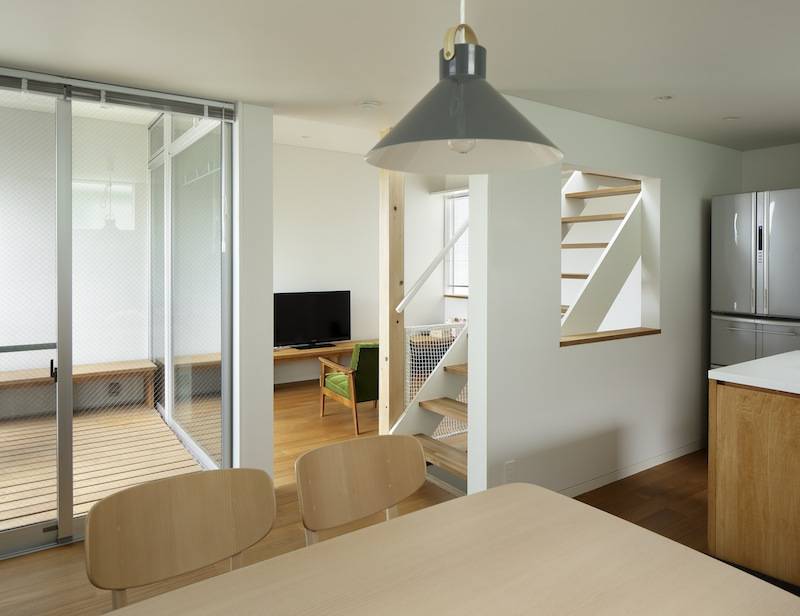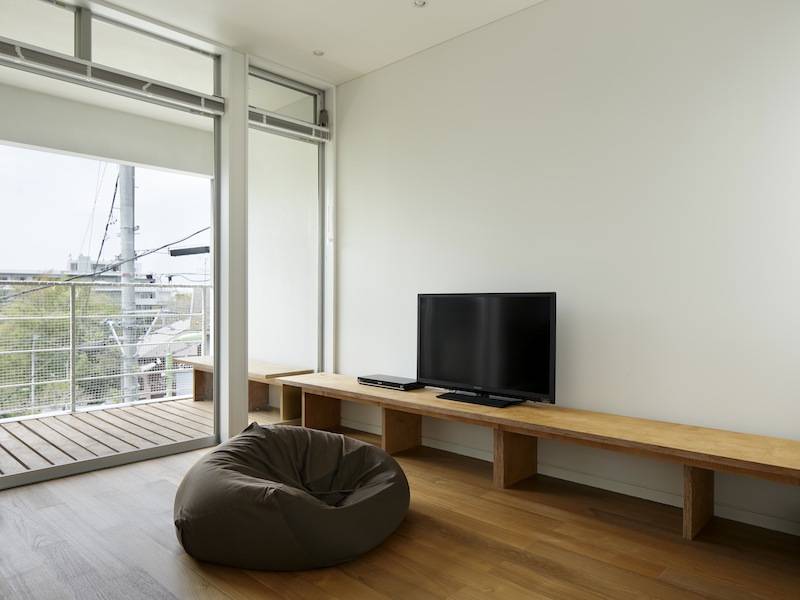 プランは中央部に階段を設けて各階の空間を分節している。1階は夫妻の寝室と洗面浴室などの水回り、2階は階段を挟んだLDKとバルコニー、3階は子供室となっている。リビングに配した半外部的な空間のバルコニーが、都市と家族のプライベートな生活との1つの距離感を表現している。