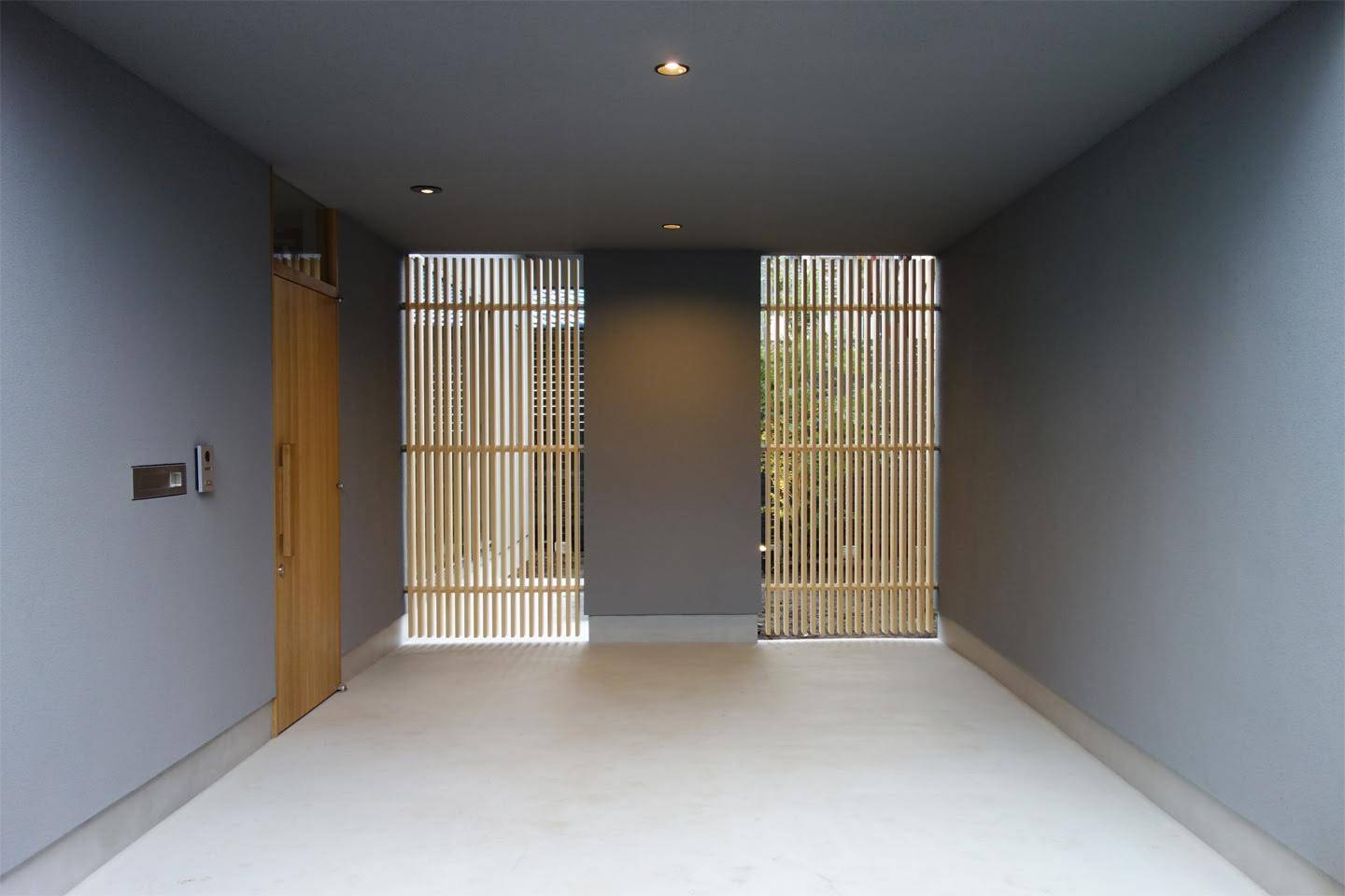静かな路地を奥に進むと広いピロティがあり、格子の奥は中庭へとつながります。