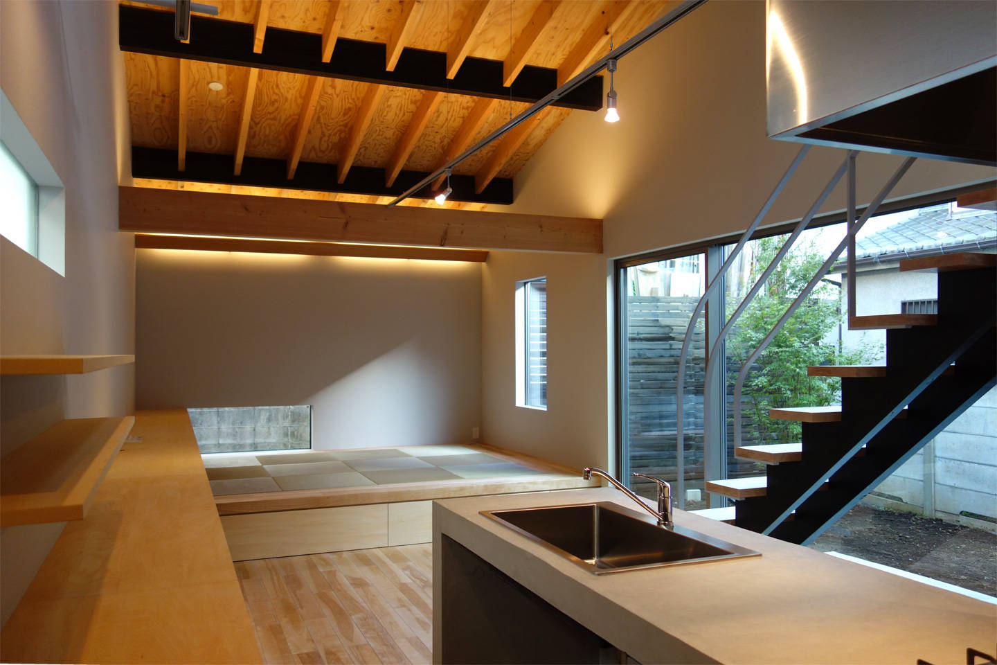 LDKの様子です。大きな傾斜天井は屋根の構造が現され、黒い部分には柿渋と松煙を混ぜた渋墨が塗られています。