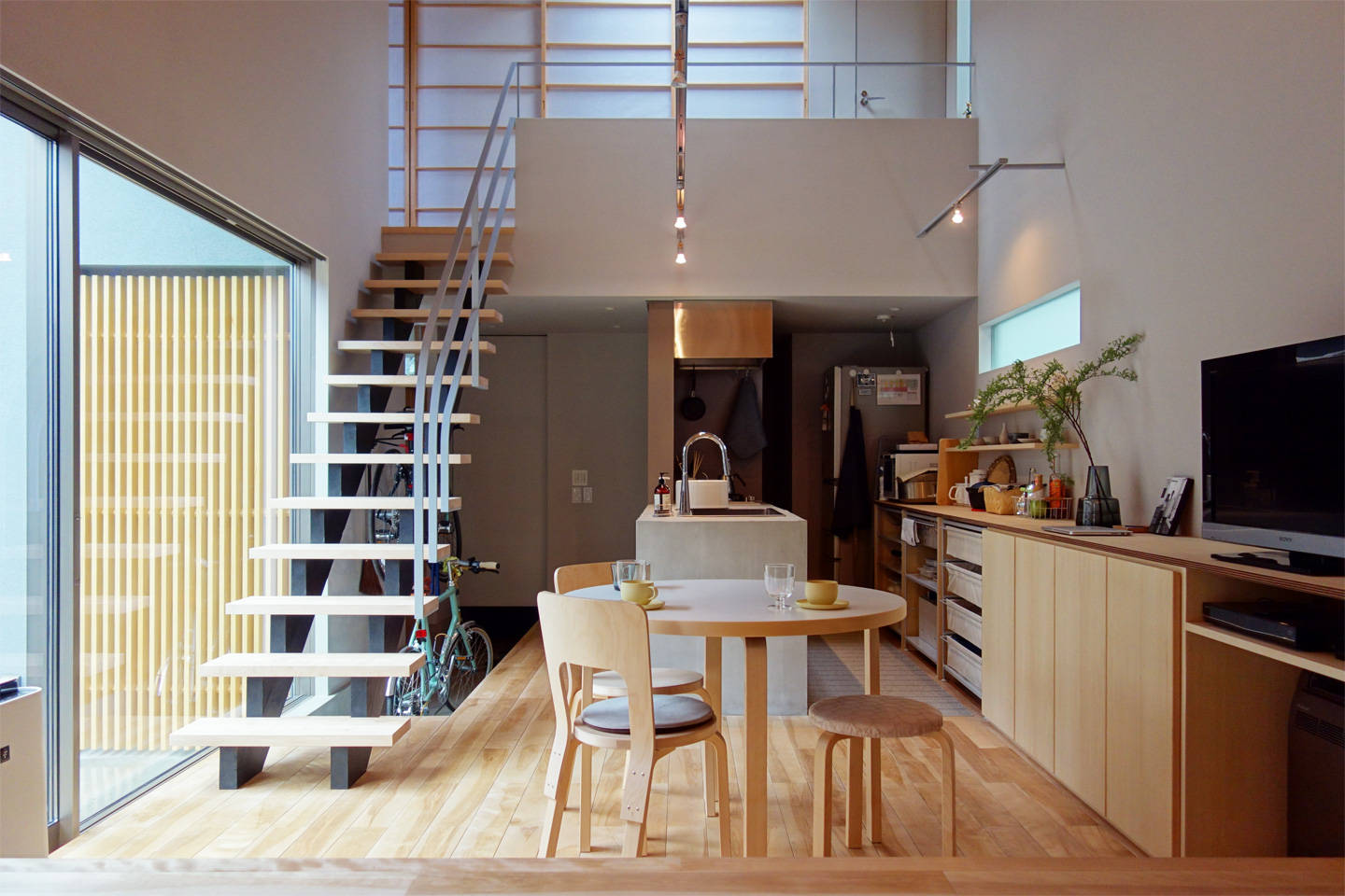 家の中心にコンクリートのキッチンが置かれ、クライアントお気に入りのダイニングテーブルが置かれています。