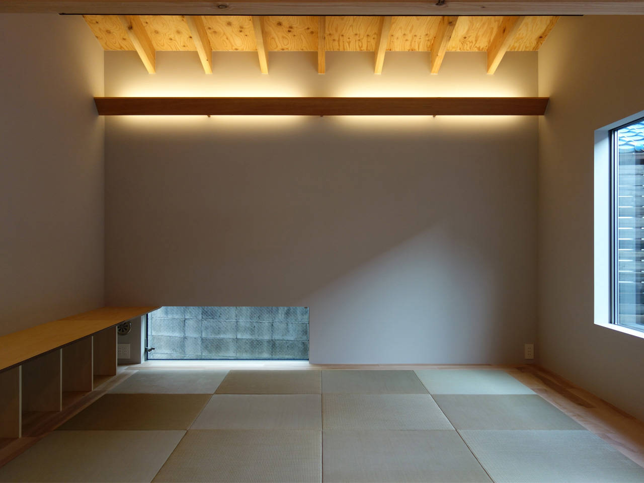 間接照明のある小上がりの畳の下は引き出し収納になっていて、客用の布団などが収納できます。