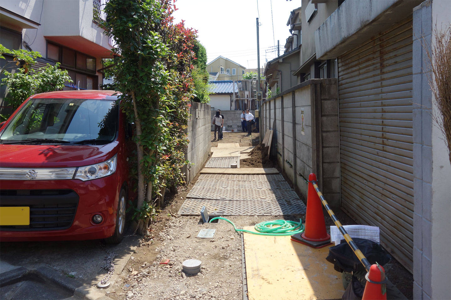 着工前の敷地の様子です。敷地の入り口は工事車両が入らないため、手作業で材料を運びました。