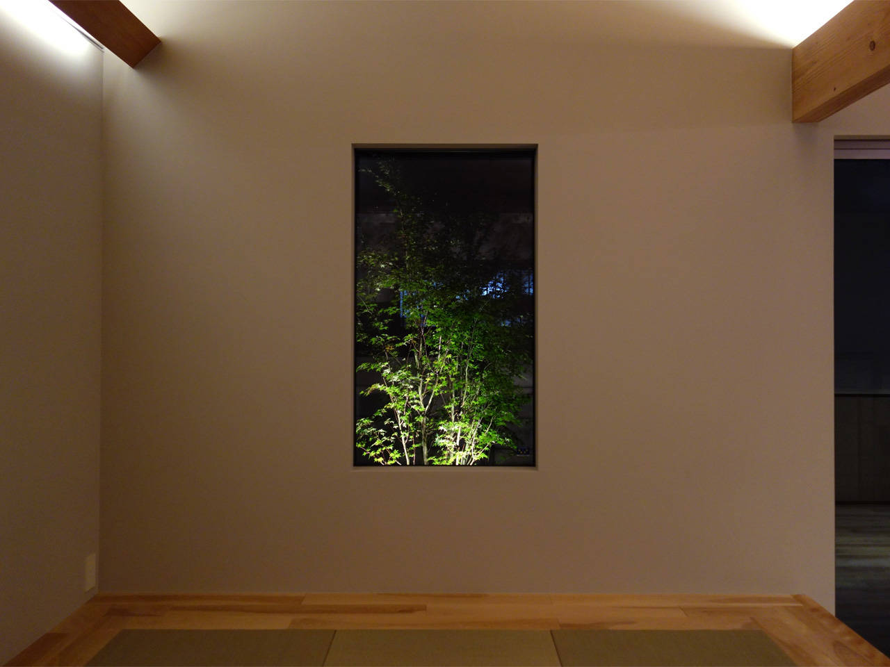 小上がりには掛け軸のように外の景色を切り取る窓があり、中庭のもみじが見えます。