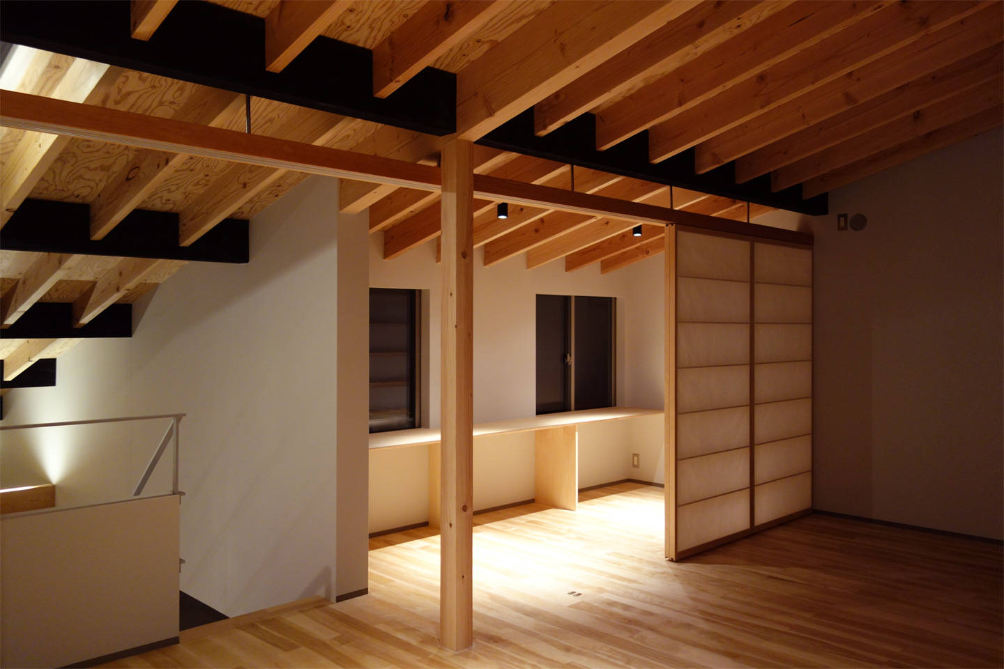 夜の2階の様子です。細長い部屋は、生活スタイルに応じて間仕切り壁と障子で仕切れるようにしています。