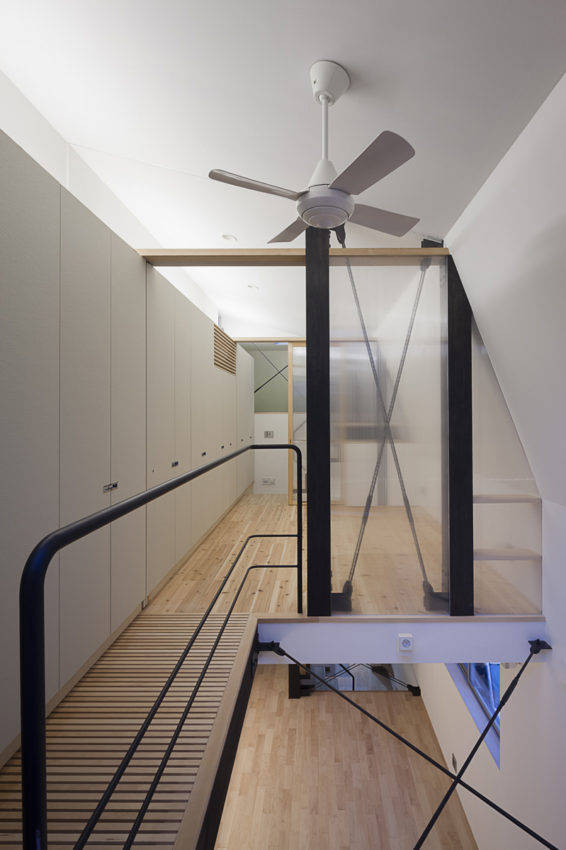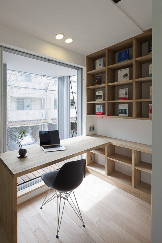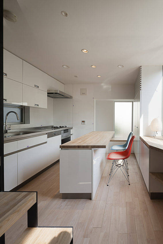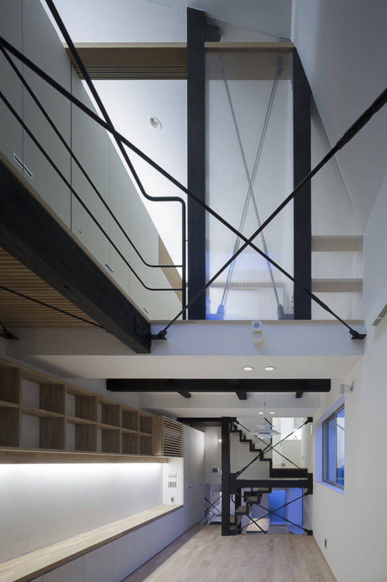 都心に建てられた木造3階建ての住宅。敷地の形状は間口4m、奥行き14.5m、所謂「うなぎの寝床」。このような場所で豊かに暮らすには、それなりの工夫も必要です。この敷地特性を上手く活かすため、内部は階段を挟んだスキップフロアで構成し、各フロアが緩やかに繋がり、奥行きのある空間となっております。
