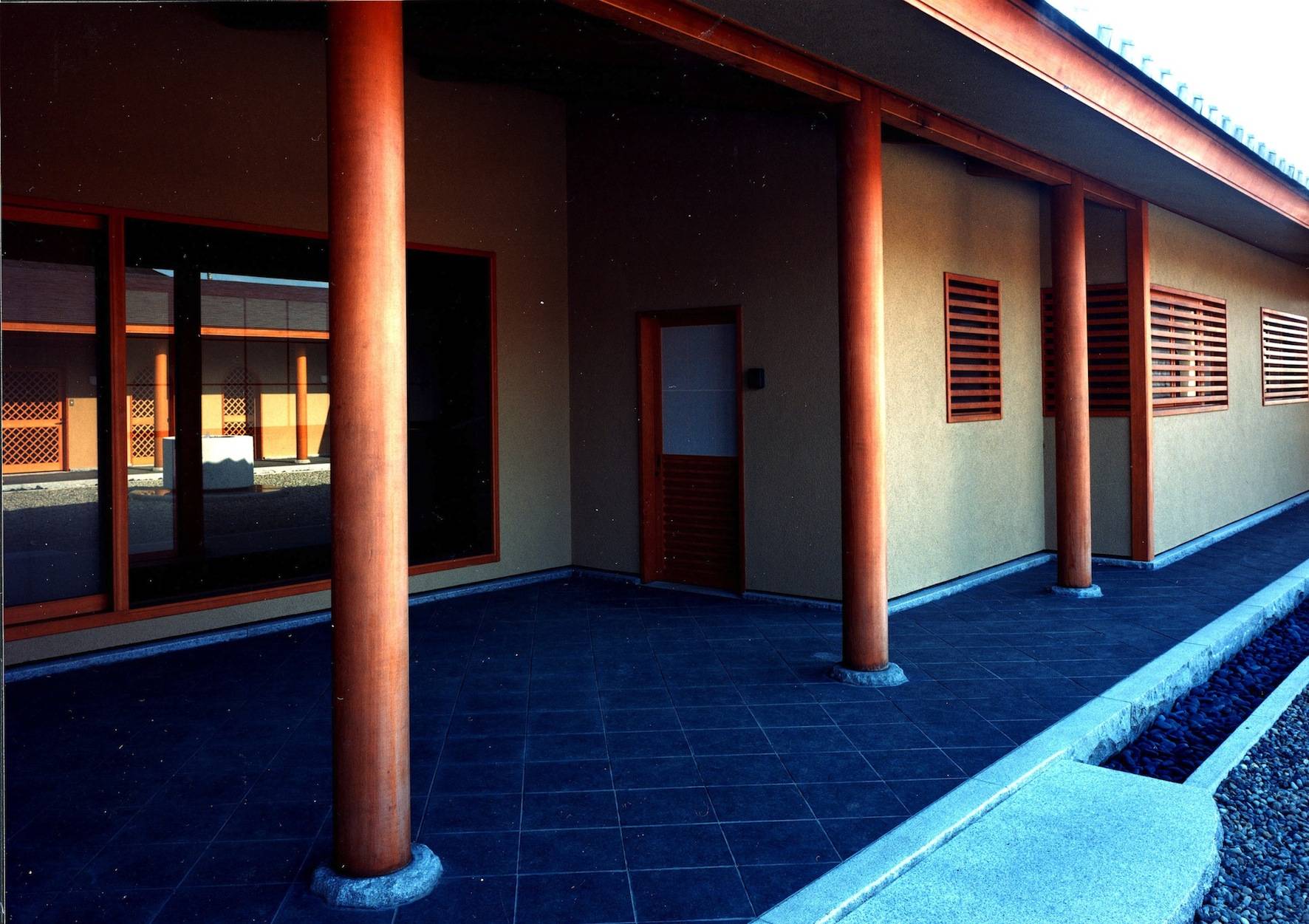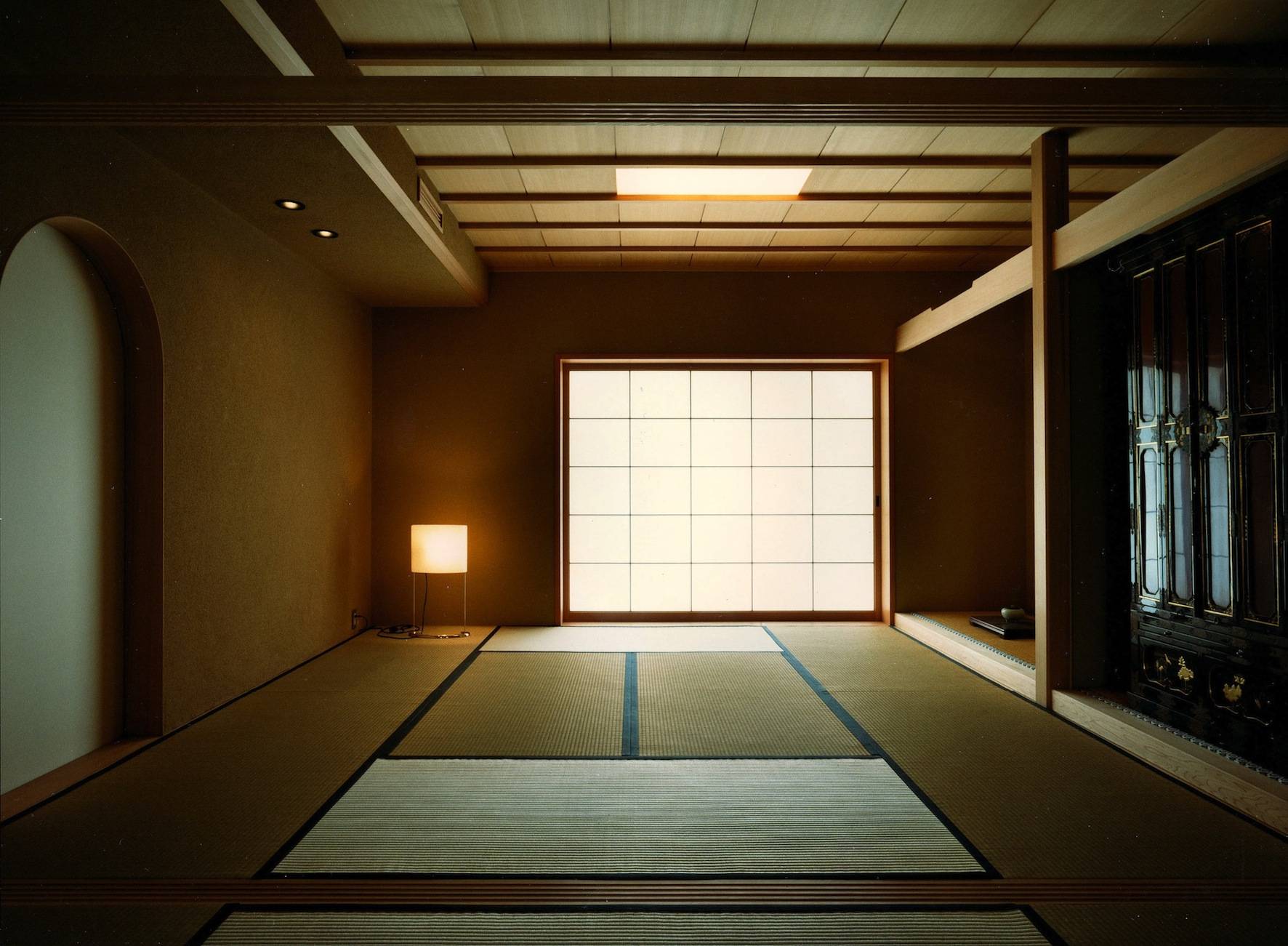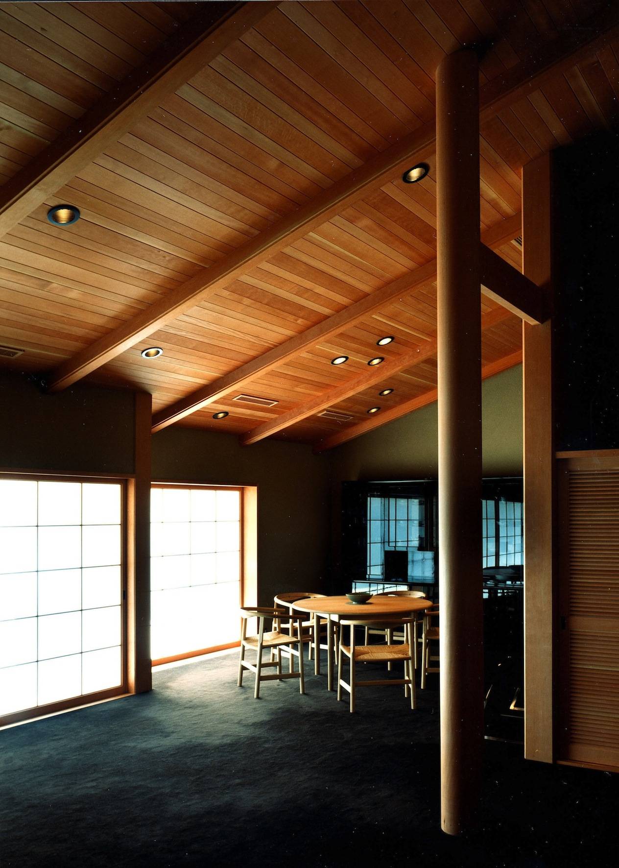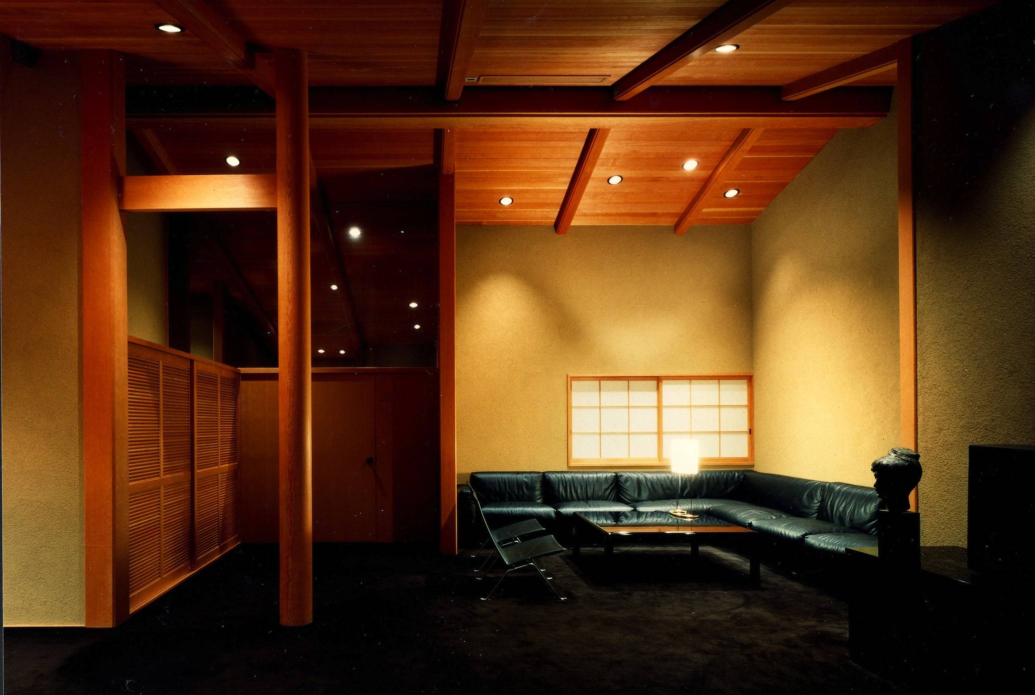水戸市郊外、まもなく大洗の海へ流れ出る涸沼川のほとりに、建主が晩年の自己研鑽を目的に建てられた個人住宅であるが、また時折訪れる客人達のために「場」が設けてある。