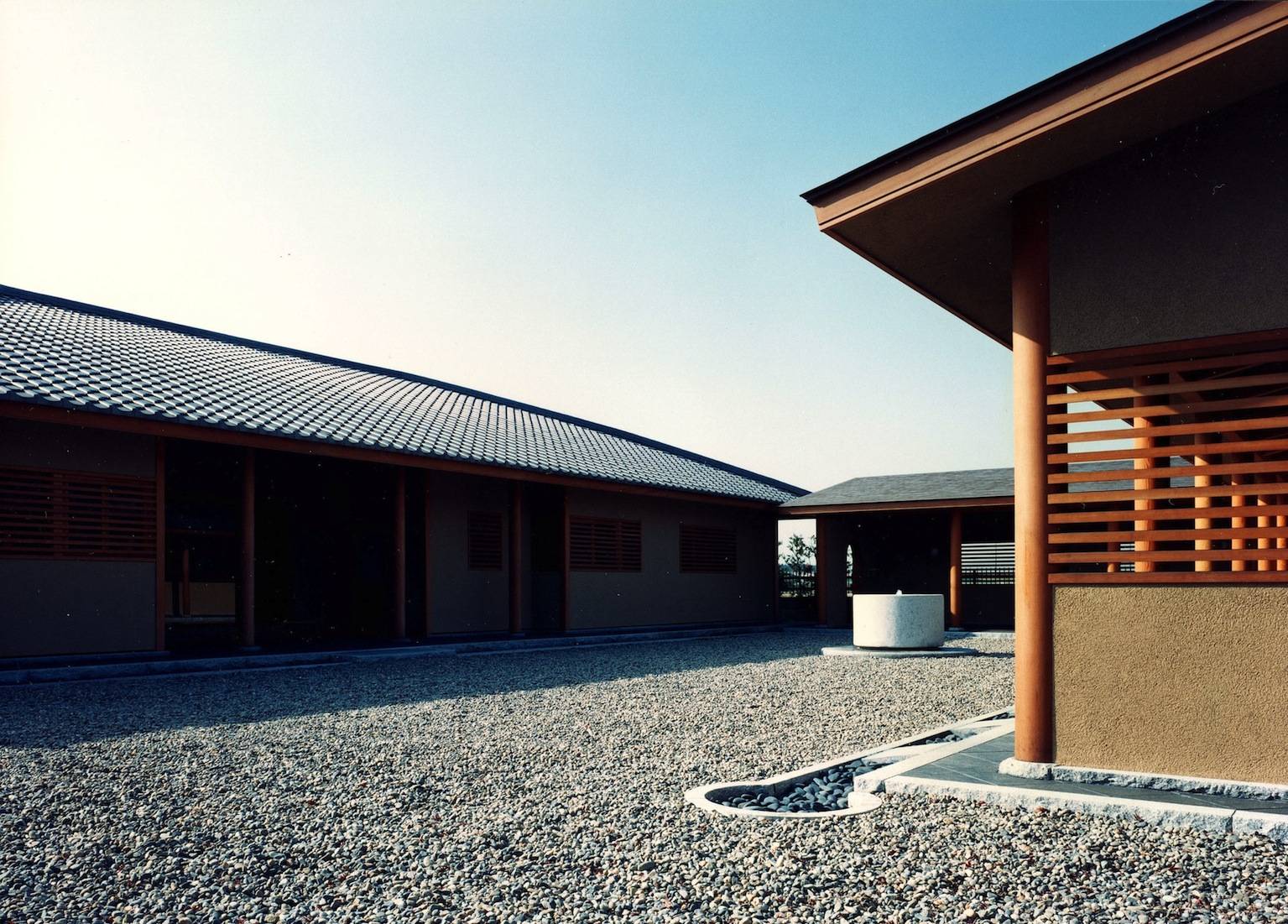 住宅全体は門屋、砂利敷きの中庭を囲んで回廊、そして主屋とで一つに構成されている。遠く西の水平線に雲のように映る筑波の山並みを背景に、主屋の屋根を瓦の一枚大屋根で覆った。