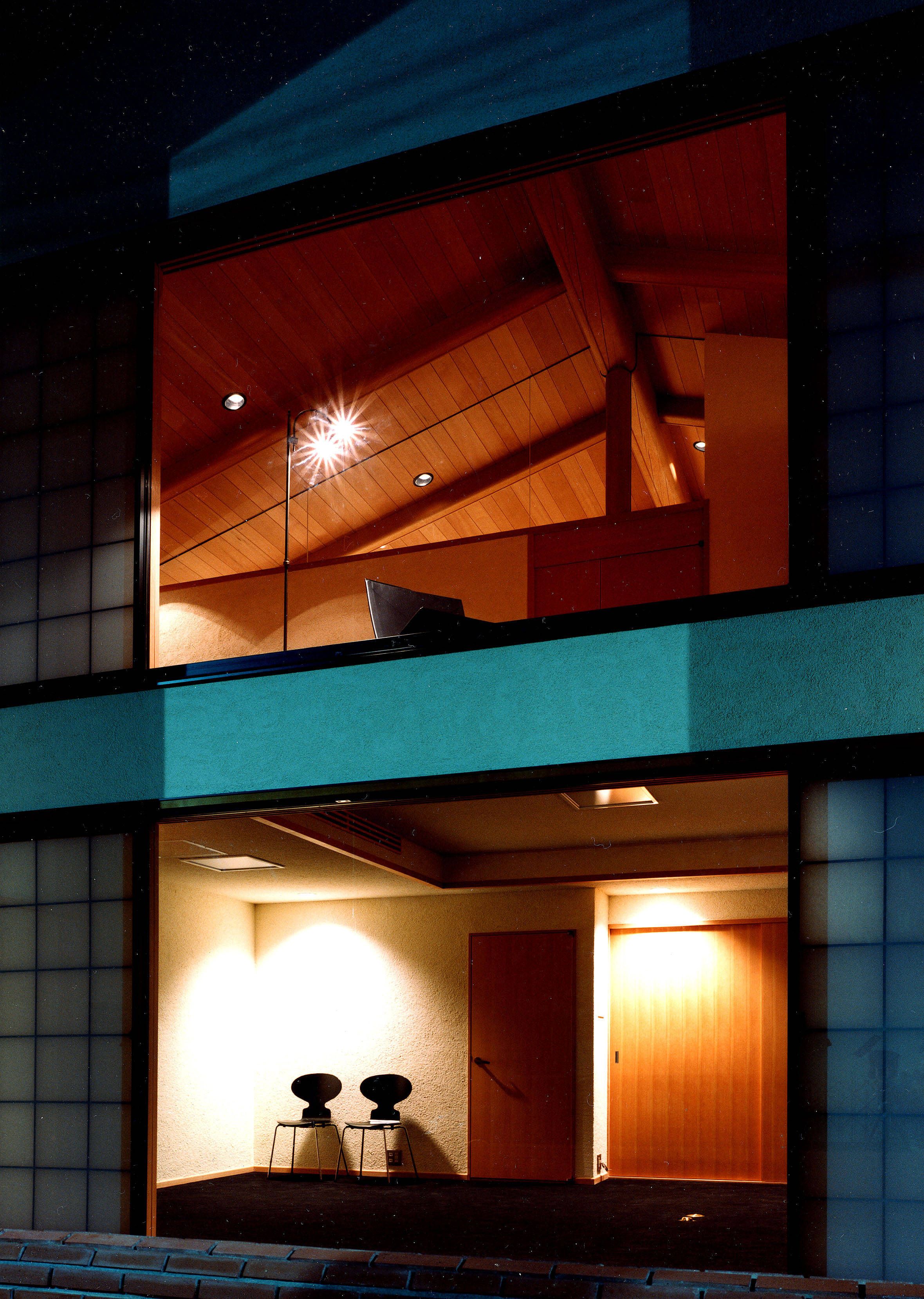 1階は南側から入れる事務所とカースペース奥東に住まいの玄関とし、玄関を入ると吹抜けの階段ホールとなっている。階段はコンクリート造とし、表面は荒い砕り仕上げとなっている。2階は南にリビング、ダイニング、キッチンがあり、西に寝室が2部屋ある。