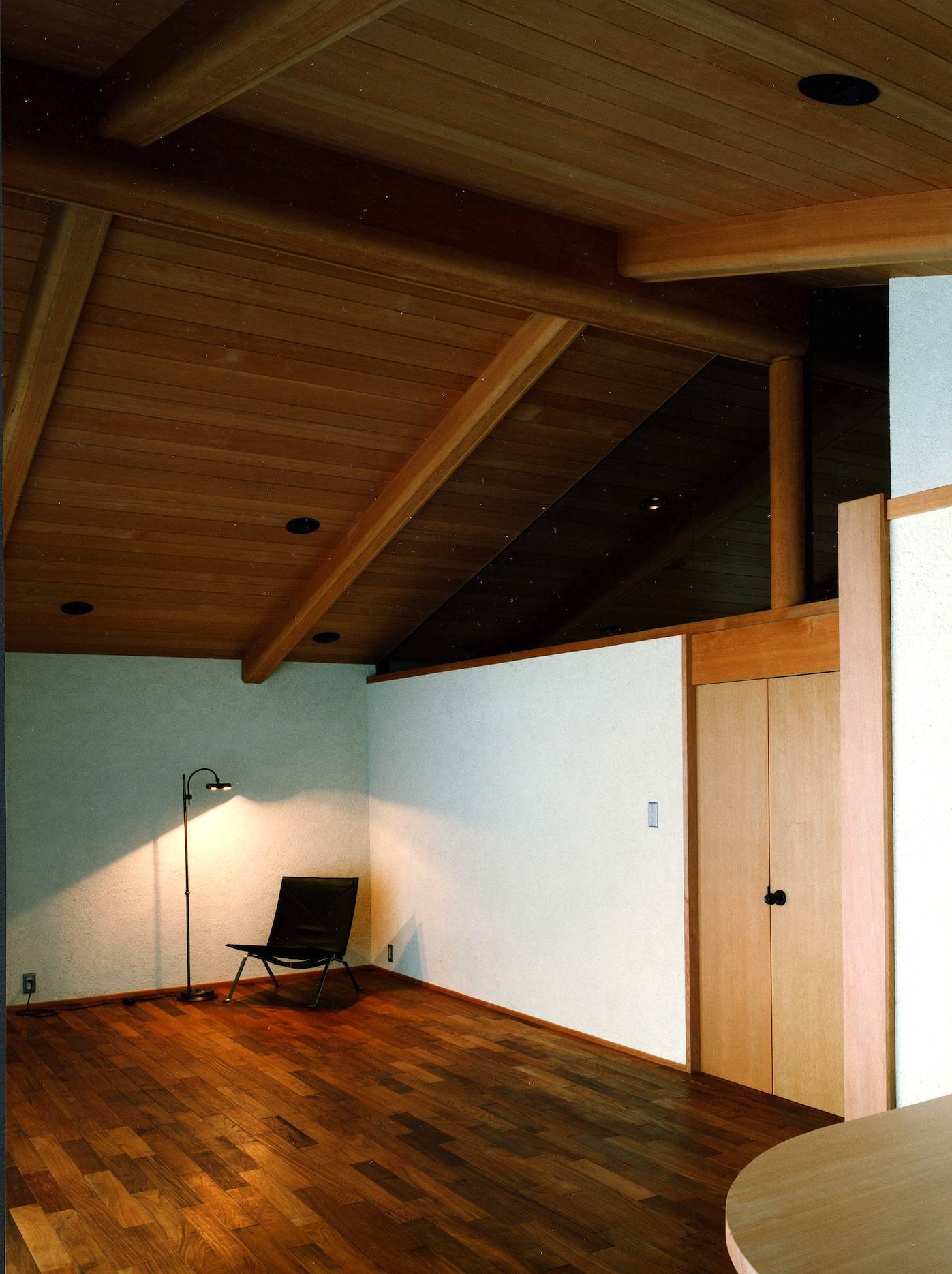 通し柱は8寸、大棟木1尺5寸に登り梁1尺を12本架け、がっしりとした骨組みを作り、これをそのまま建物のデザインとした。住宅の見えがかり造作材は全てピーラー無垢材で床のみチーク無垢材として、それぞれ時間とともに自然に色をつけていく無垢無塗装材である。壁は内外とも全てスタッコ塗りでランダムに塗り回し連続性を強調している。