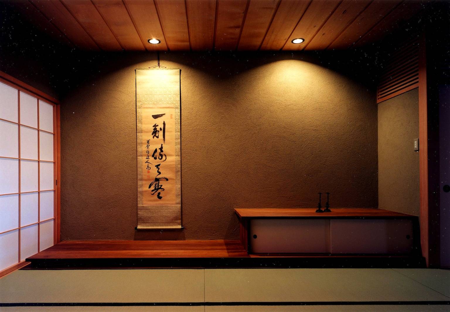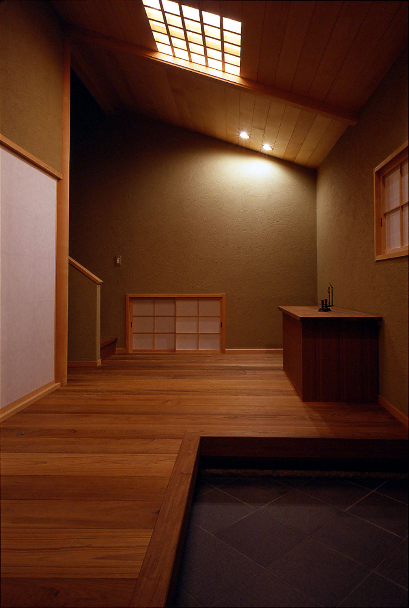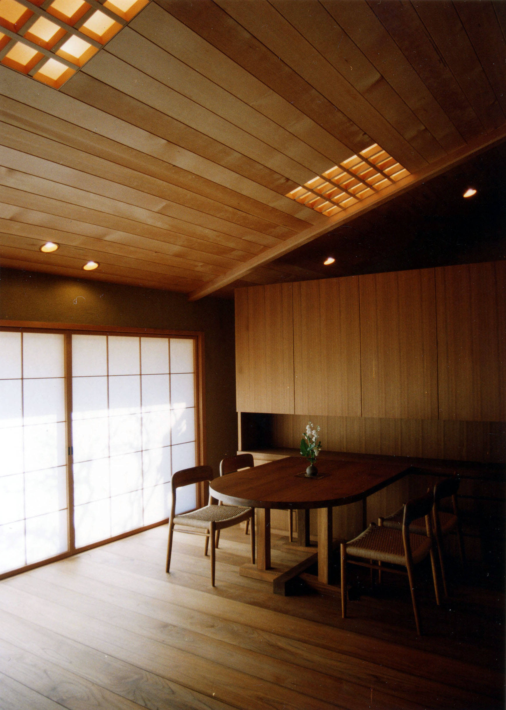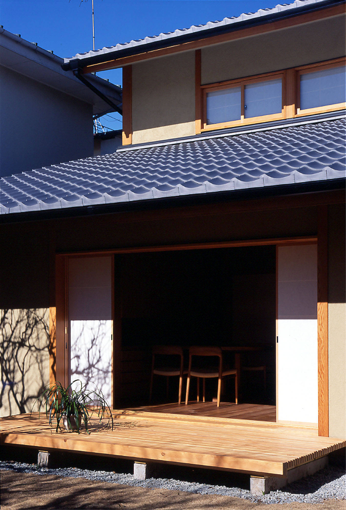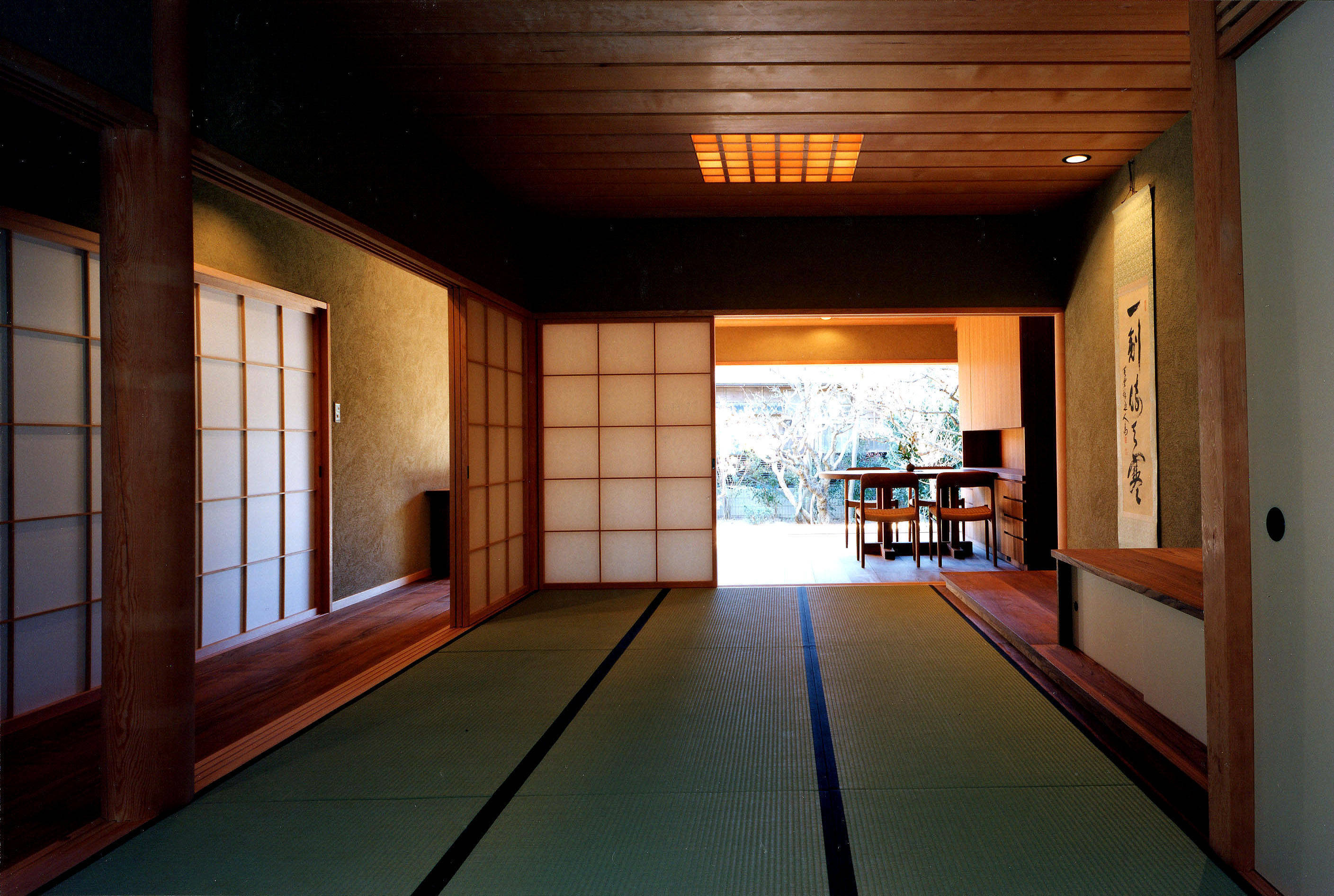南の開口部は建具が全て壁の中に収納できるようになっており、開くと開口部が全開となり、同レベルの濡れ縁に出て庭を楽しむ事ができる。