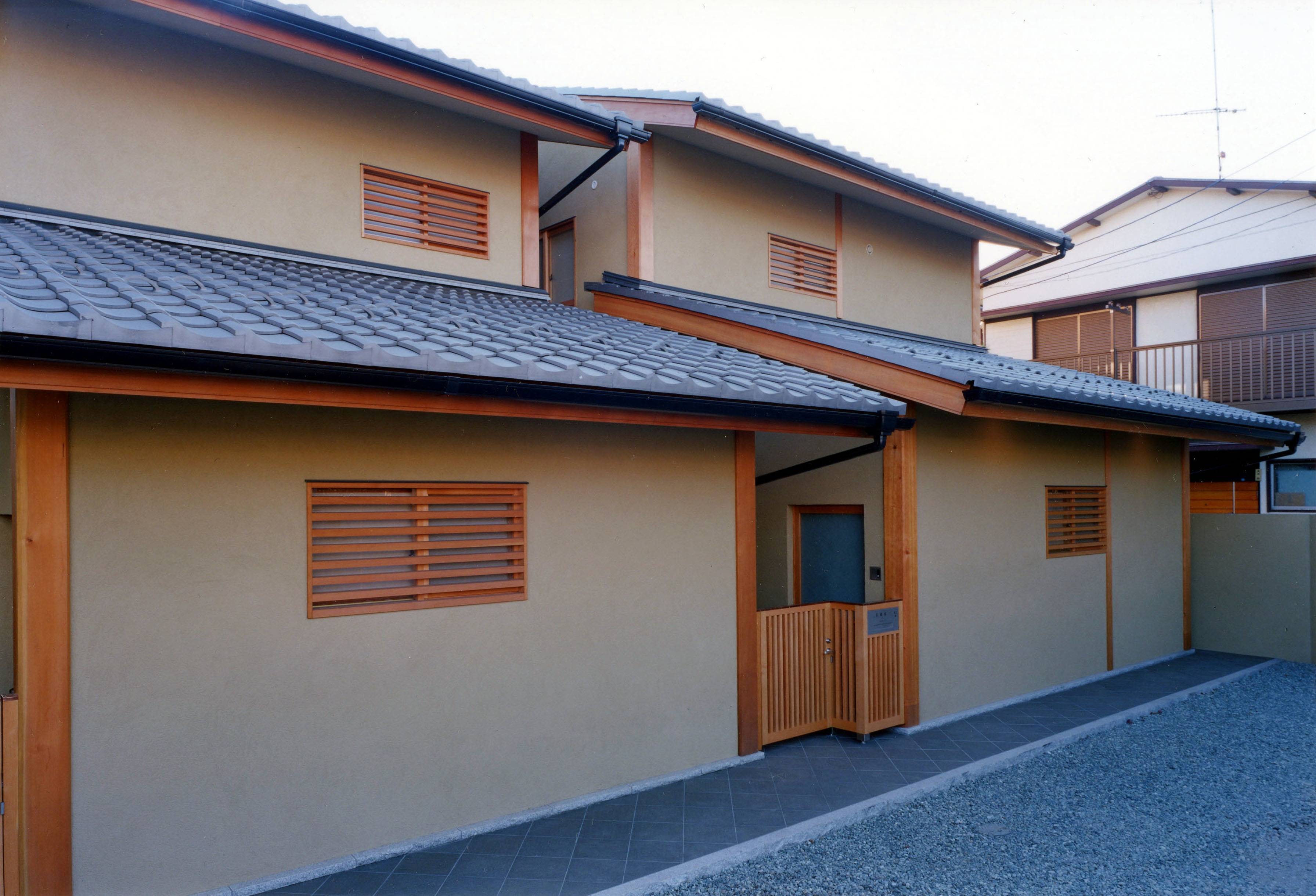 独立した二世帯住宅であるが、一つの敷地に建つ住宅として統一した外観にしている。しかし二棟の配置は微妙にずらし、高さにも変化をつけている。二棟の内部はそれぞれの必要機能によって異なり、大きさも雰囲気も違いがある。