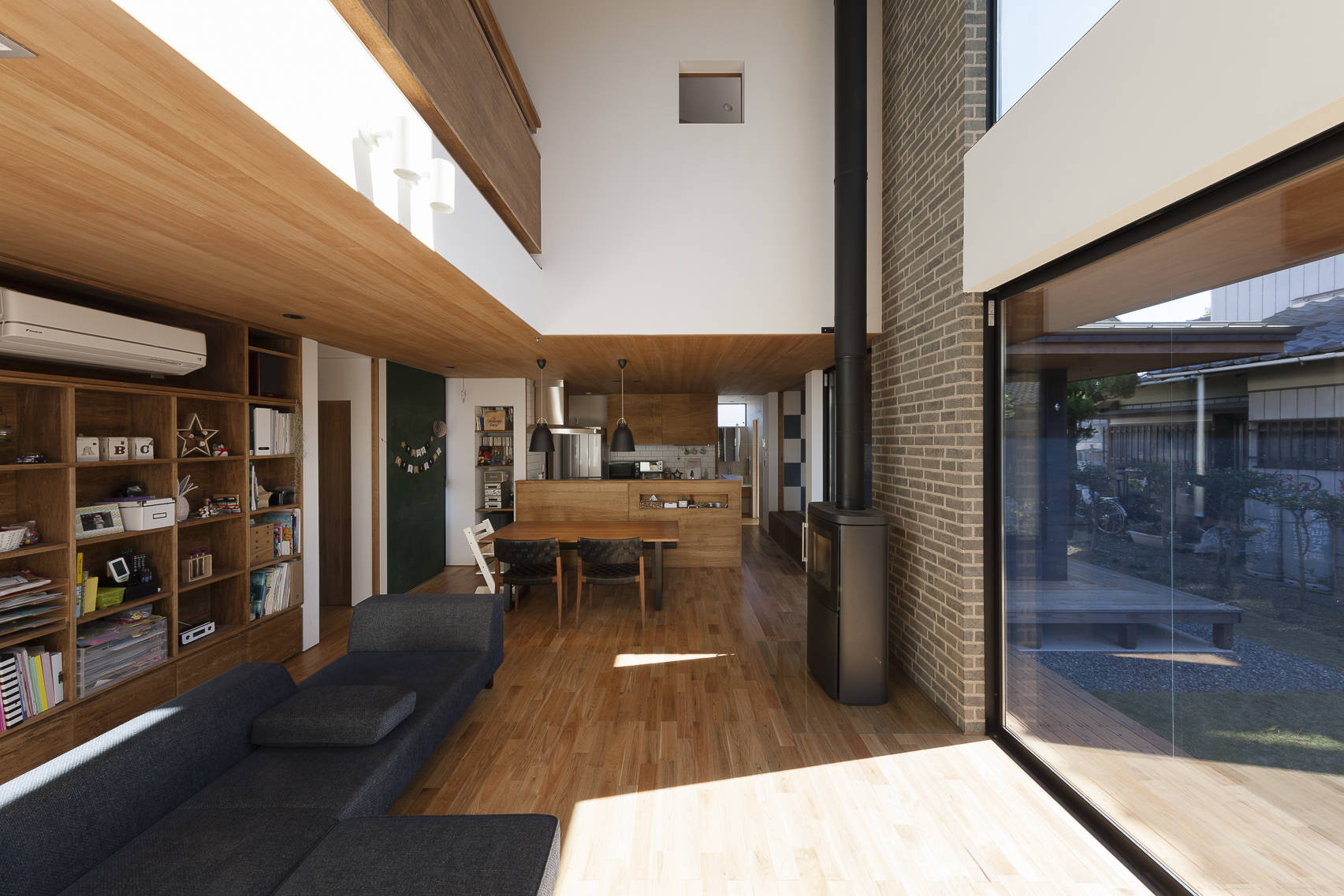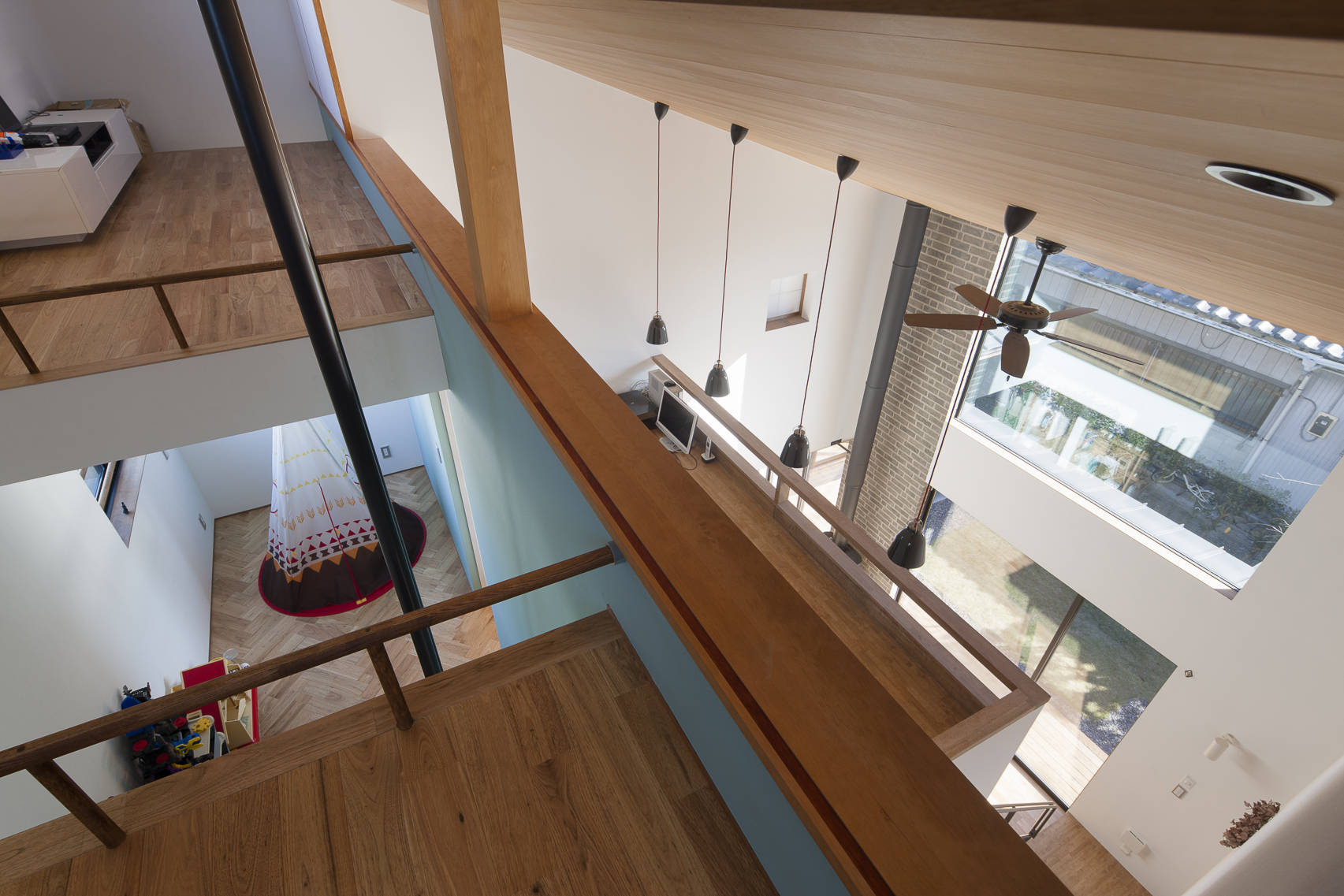ロフト空間は16帖あり、世帯間で回遊できる構成。子世帯には7.5帖の吹抜があり、それに面して長さ3.5mのファミリーデスクがあります。そこから見る景色は、室内に薪ストーブが鎮座、その背面に手づくりタイルが貼られ、大きな窓の向こうには、祖父母が住む瓦屋根の実家が臨めます。