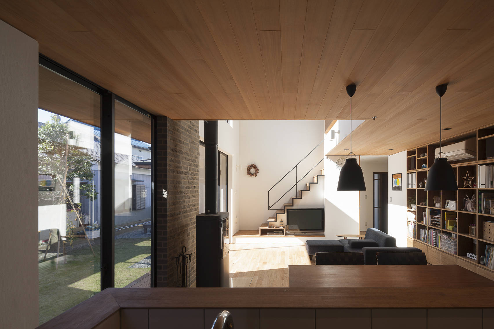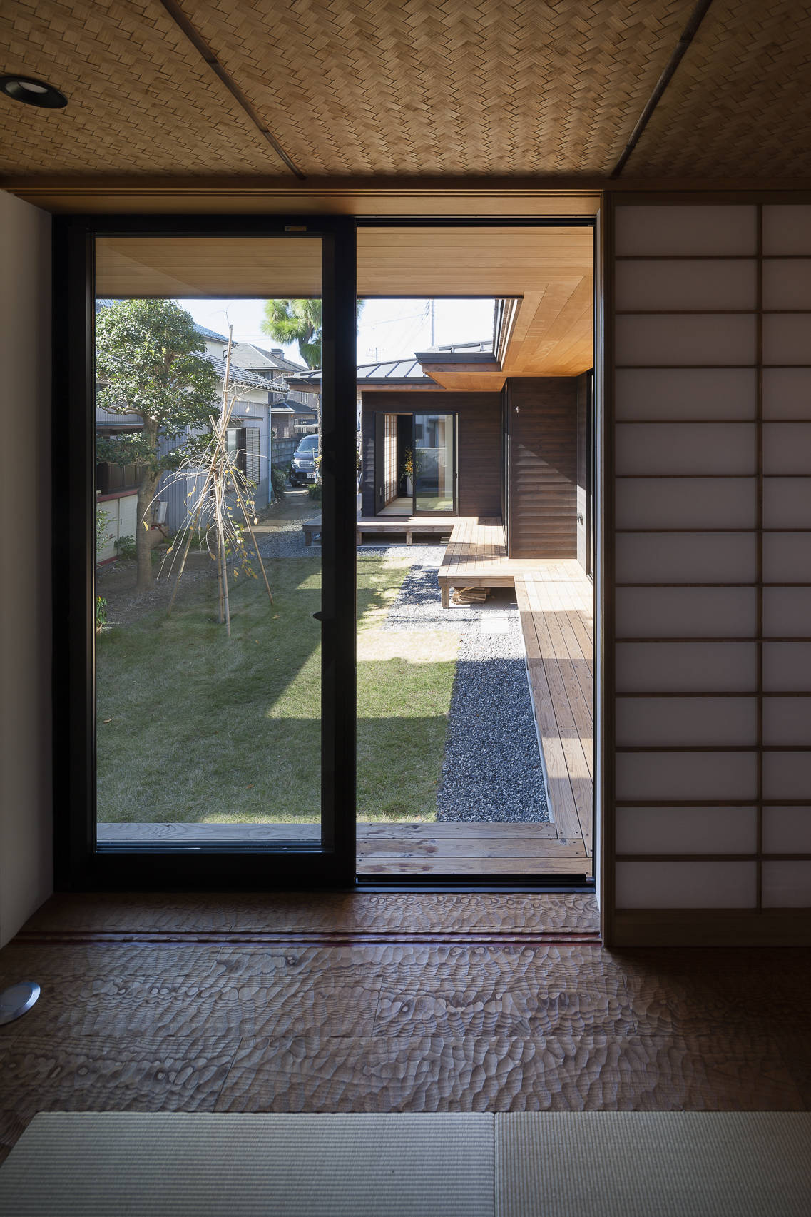両親2人、夫婦2人+子供3人が暮らす二世帯住宅。大きな特徴としては、縁側が長いこと。両世帯のLDKや和室を外部空間で繋いでいます。外壁の黒い板張りと、飴色をした軒天とのコントラストが美しく、雁行しながら奥へ奥へと繋がっており、その全長は25メートルもあります。