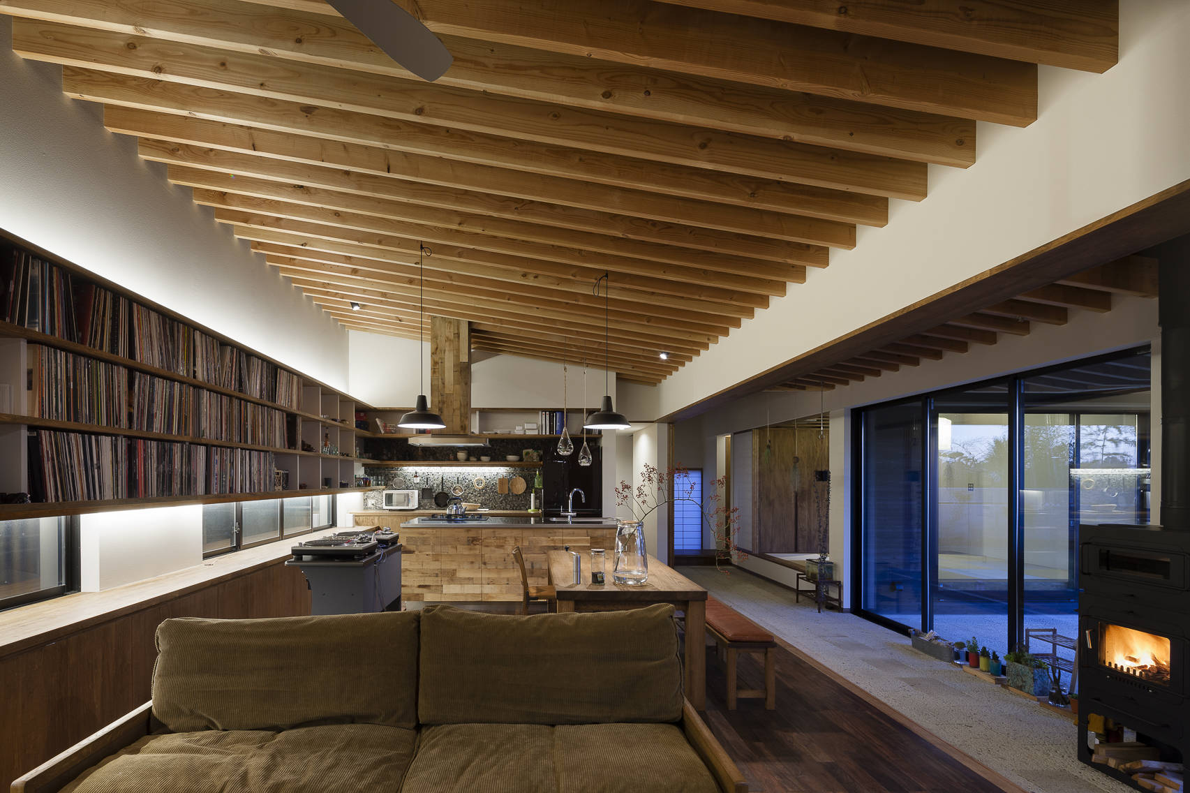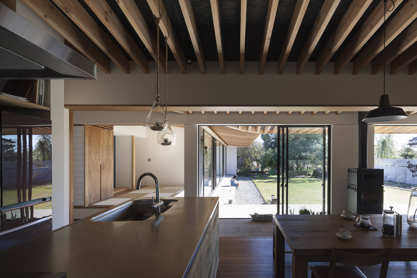 土間に置かれた「オーブンとコンロ付きの薪ストーブ」は、「アイランドキッチン」とともに家族の中心的存在。両方でそれぞれの特徴を活かした料理を楽しみながら、ダイニングで、土間で、軒下で、お庭で、、、生活の楽しみが広がる住宅です。