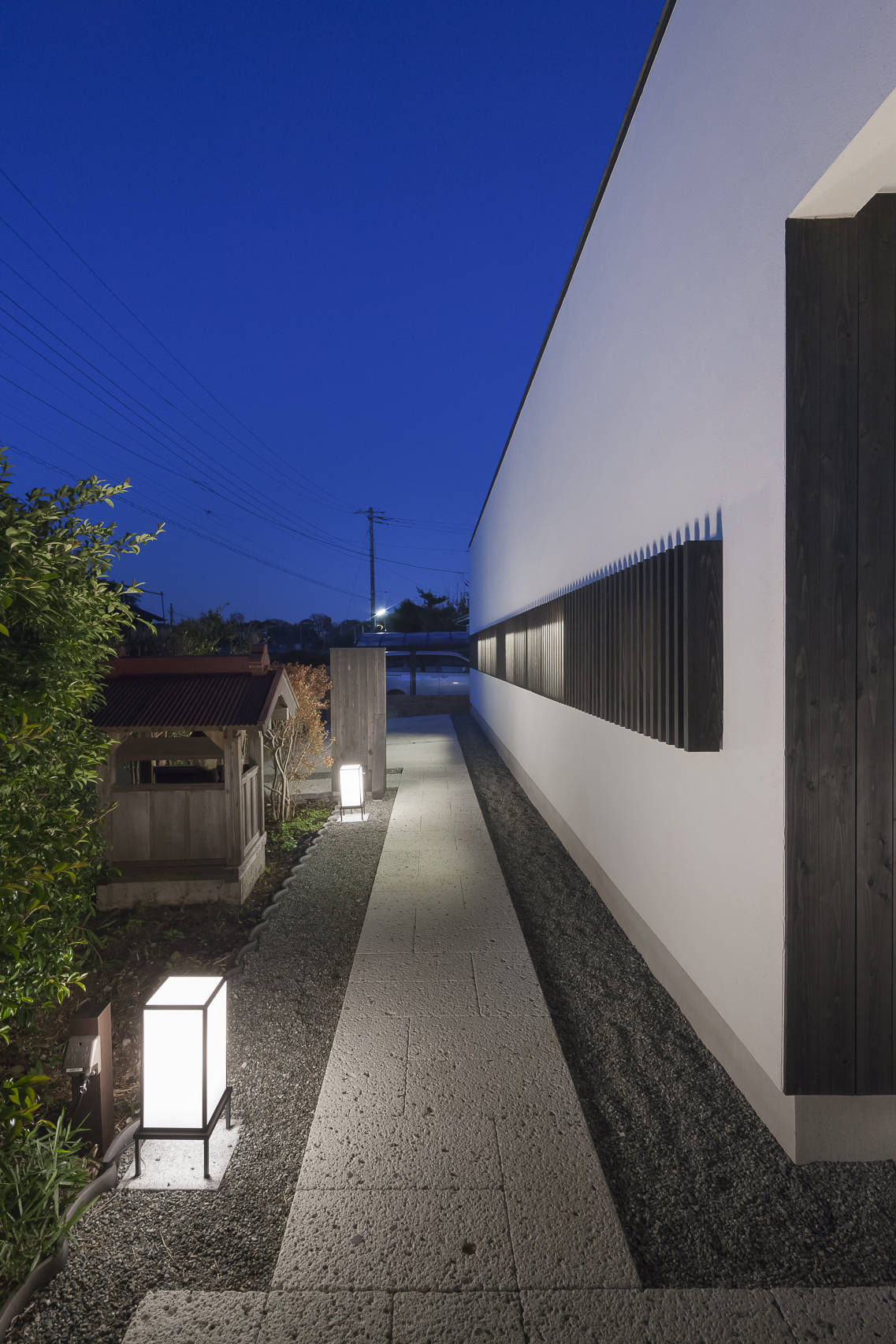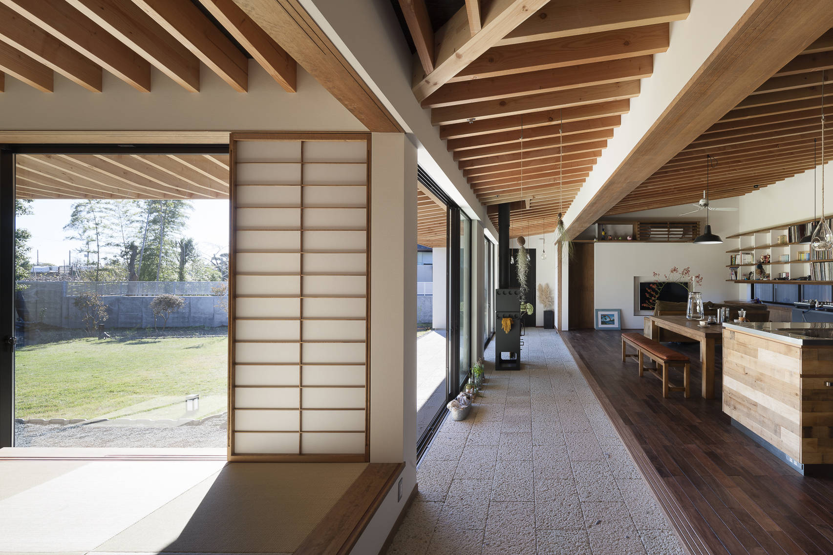土間を中心に「みんなの居場所(LDK)」と「個の居場所(個室群)」をL型に配置。LDK、土間、軒下、庭が一体となった空間構成です。石畳のアプローチに導かれ、玄関を入ると奥行きのある土間が伸び、 外部空間である軒下に土間が広がり、離れのように配置された個室群の前にも土間が折れ曲がって広がっています。