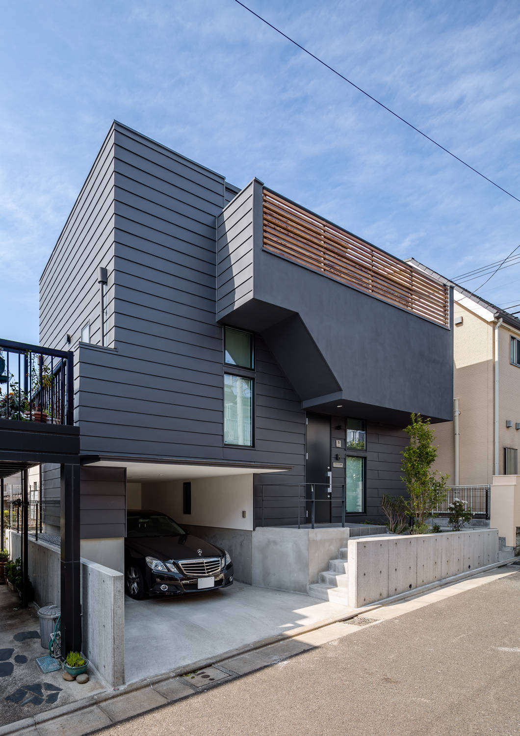 そこで建物の形状は法的規制内で最大面積かつ凸凹を亡くした無駄のない立方体をベースに計画を進めた。その中に「ガレージ」「LDK」「寝室」を敷地の高低差を生かしたスキップフロアの中に連続して配置し繋がりのある空間構成とすることで、連続性のある広がりを感じる住宅を目指した。