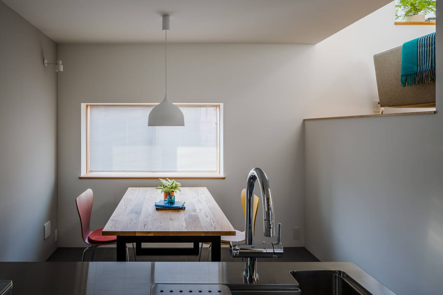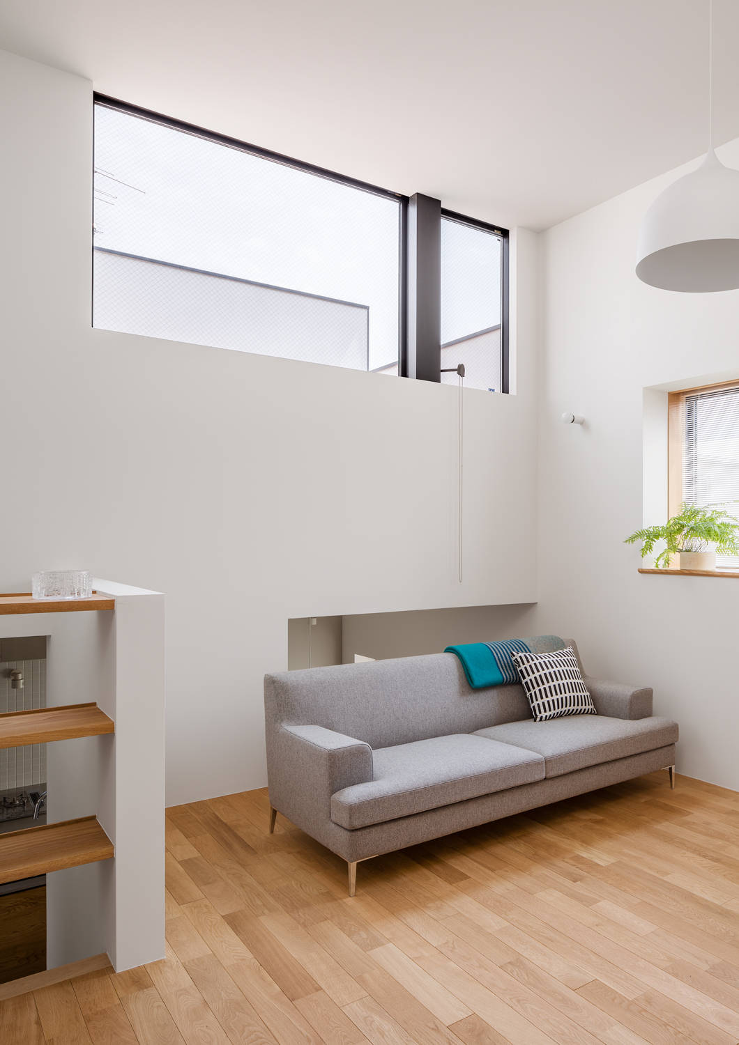 敷地条件や法的規制により、約24坪の2階建が最大ボリュームとなるコンパクトな住宅の計画である。限られた面積の中で如何に開放的な空間とするか、また都心ならではの狭小地という事でプライバシーの確保も同時に求められた。