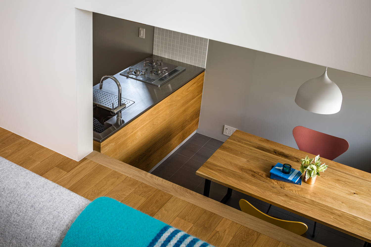 最上階にルーフテラスを設け、リビングと吹抜を介し連続した繋がりのある空間構成とすることで、外と内の繋がりを意識させ、実面積以上の広がりを感じることができる。