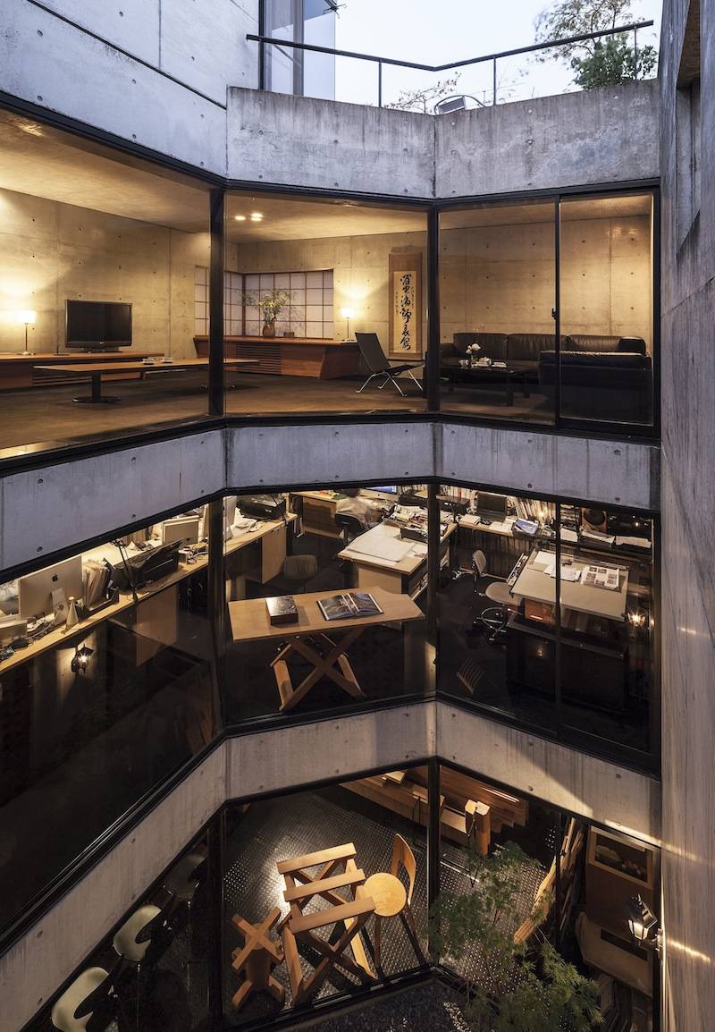 ◆外部はカタイ コンクリートで閉じ、内部はライトコート(中庭)で光と風を取り、1階から4階まで連続し流れる空間を楽しむ