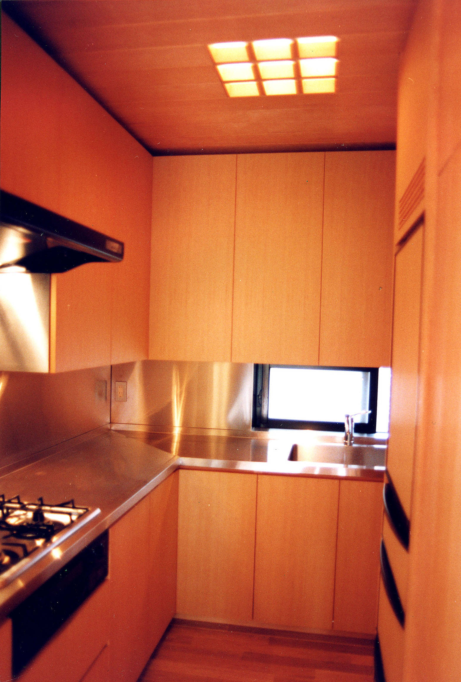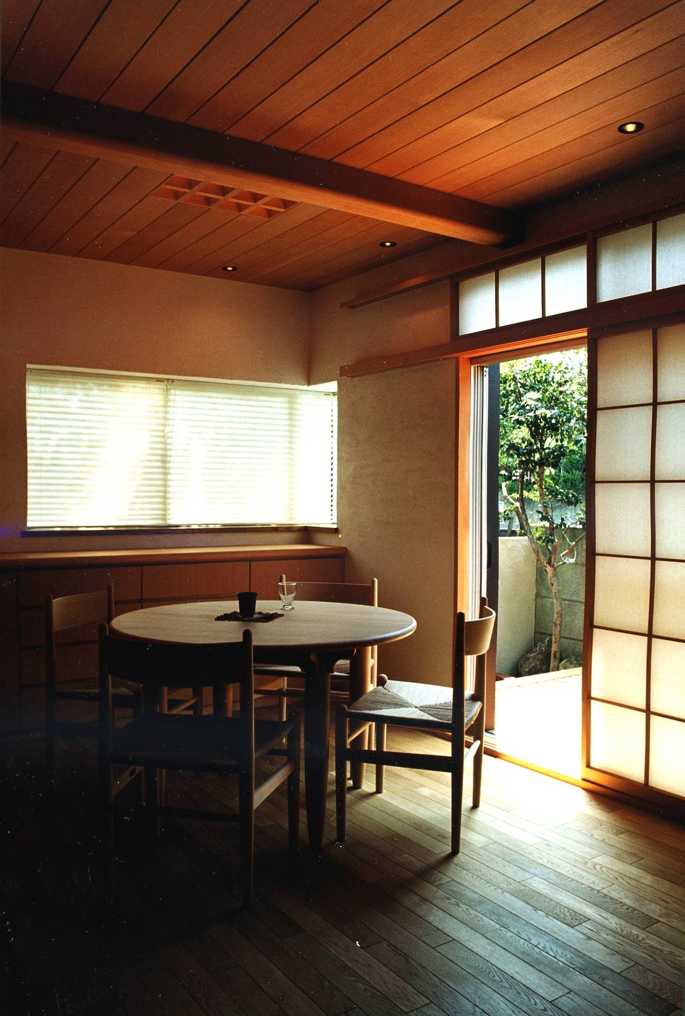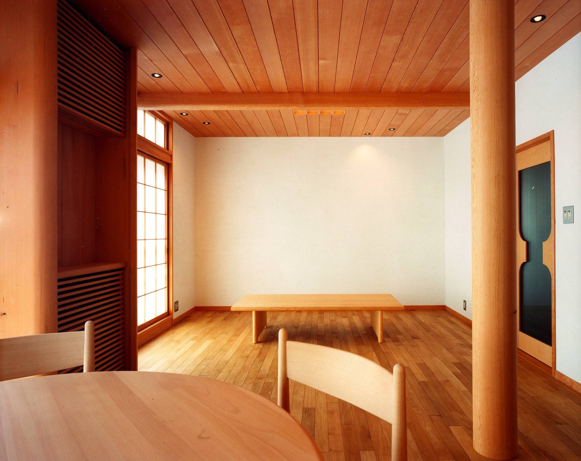 素材は極力自然に近い物を選び、無垢で力強い空間を心がけた。床はナラ無垢板のフローリング張り、天井はピーラー無垢板張り、壁は珪藻土ランダム塗りとし、断熱材はコルクボード、木造作は無塗装木地仕上げ、床のみナチュラルオイル拭き取りとした。