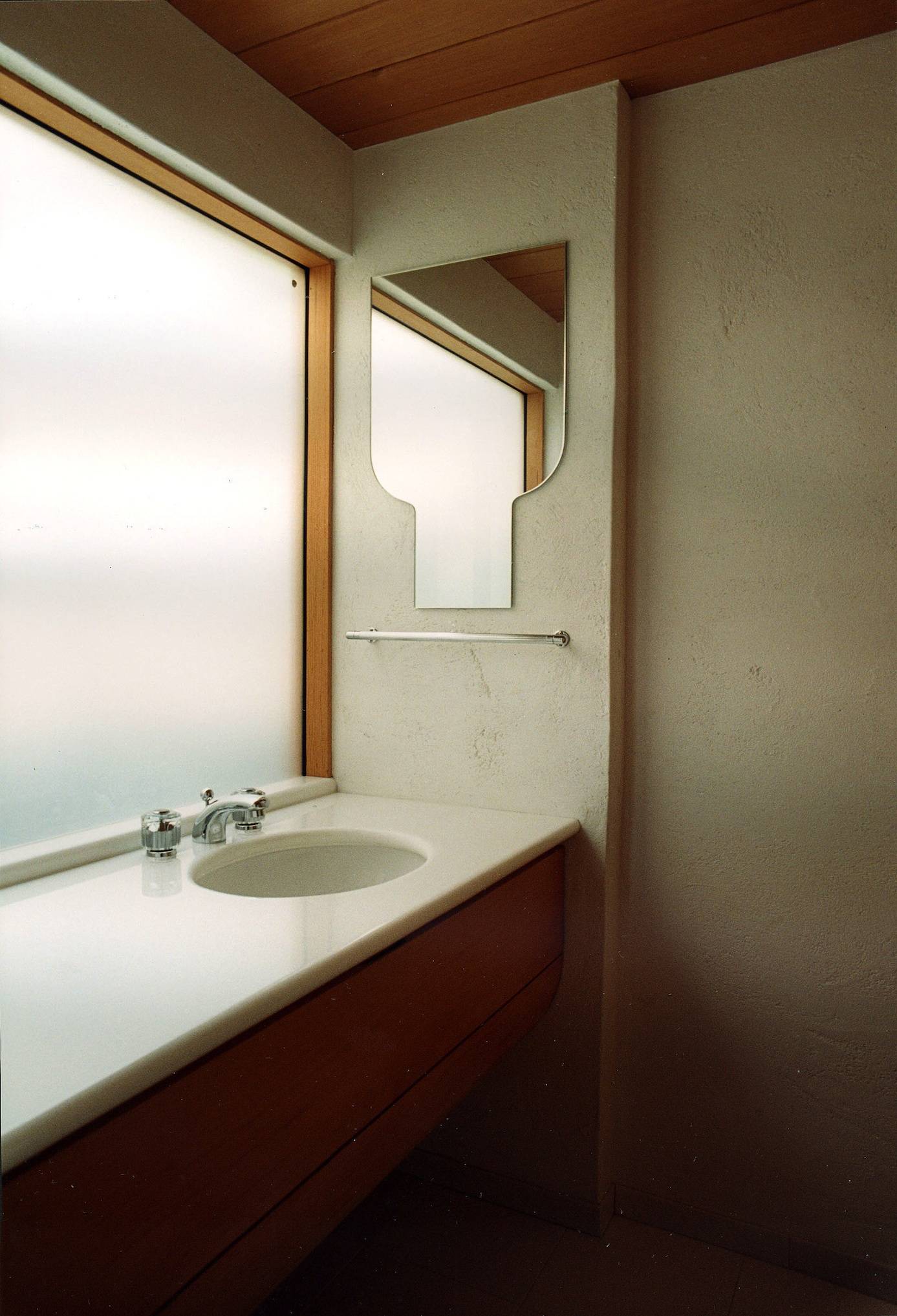 狭く薄暗い階段下のトイレを、出窓を新設して明るくゆったりとした空間に改修した。手洗いも広く取り、カウンターはタソスホワイト(ギリシャの白大理石)で白を基調にしている。