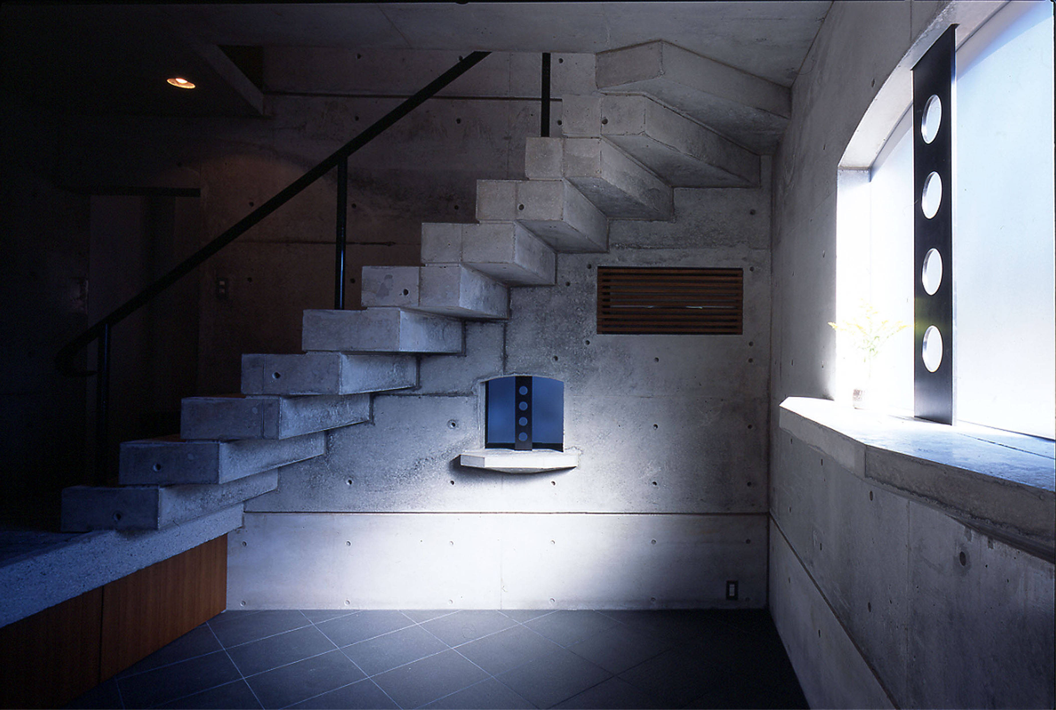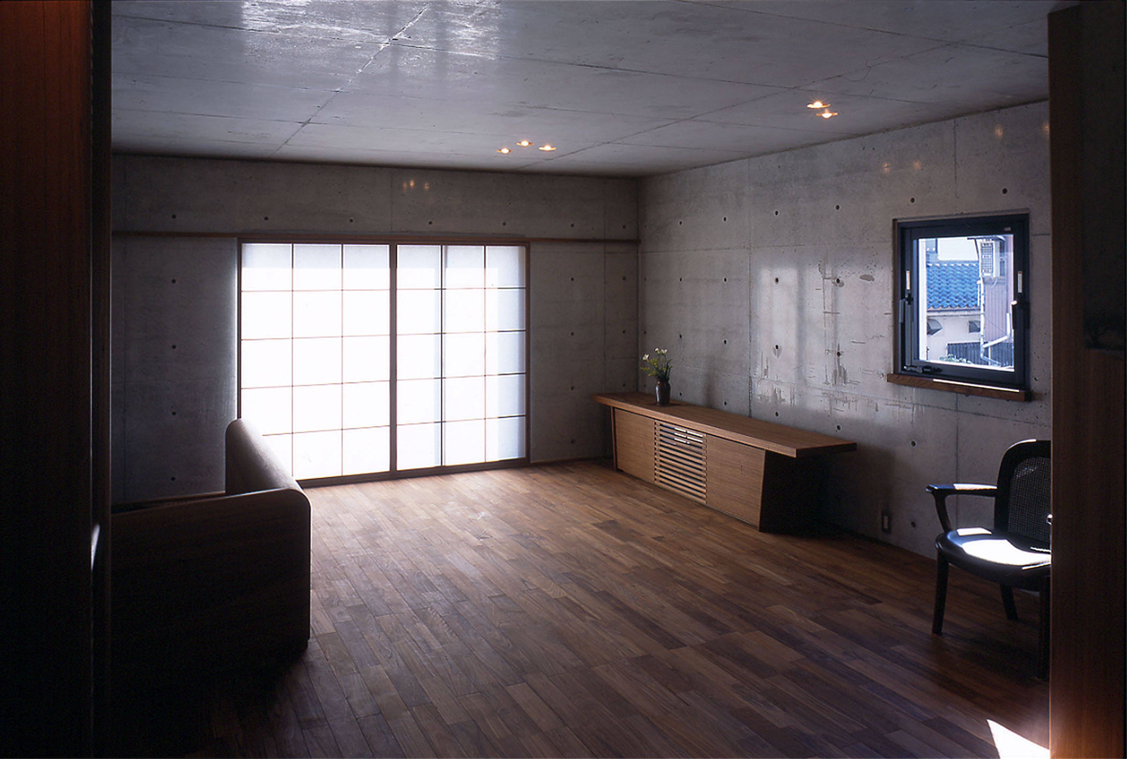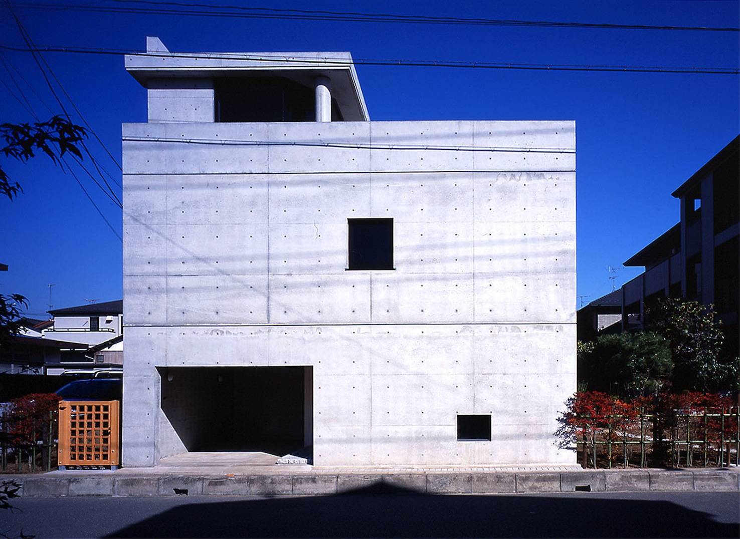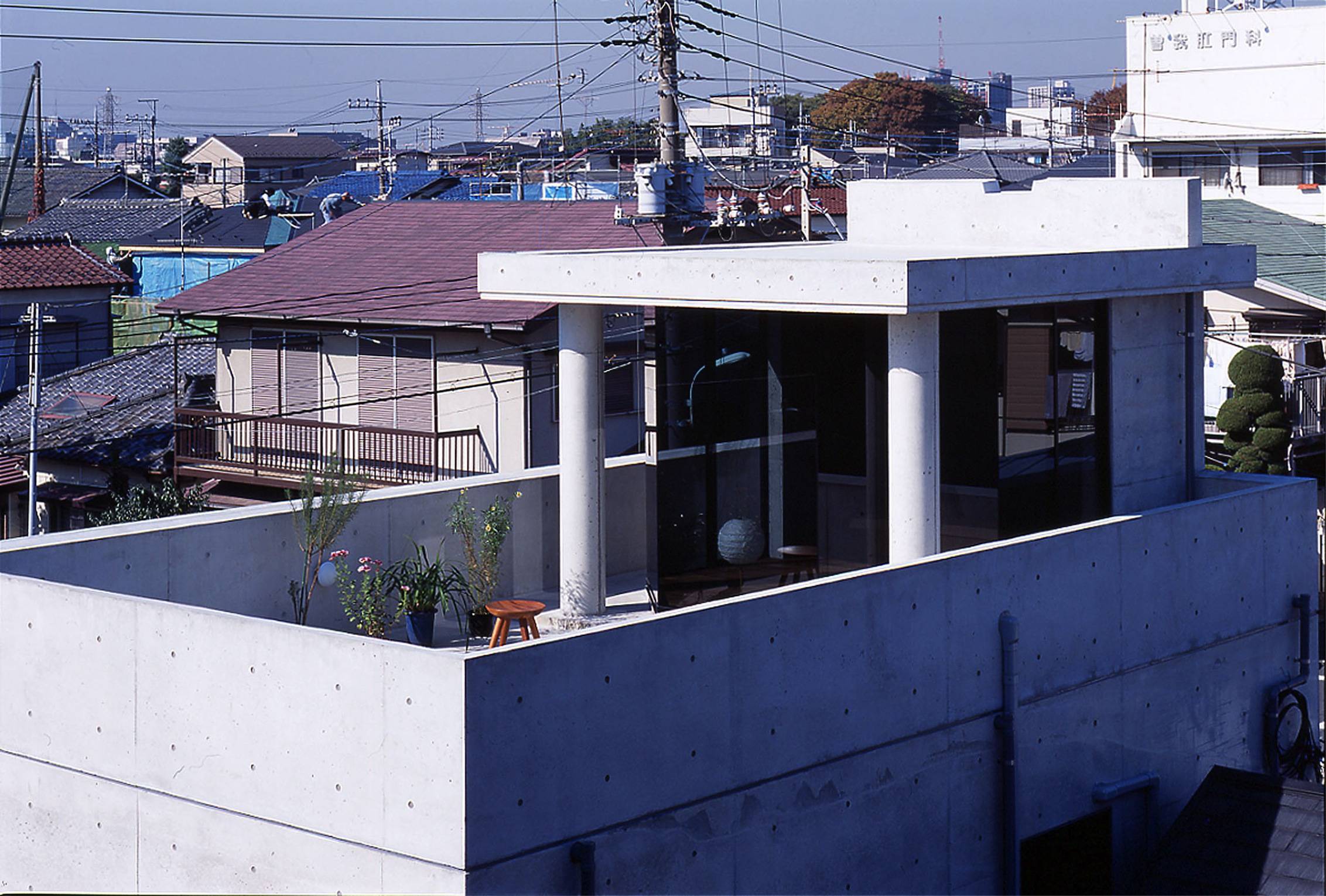 区画整理事業が行われた住宅地の一角にある敷地で、東奥には築約40年の趣のある木造平屋が建っている。今回は道路側の窓の一部に別棟としてコンクリート打ち放し3階建ての家を計画した。