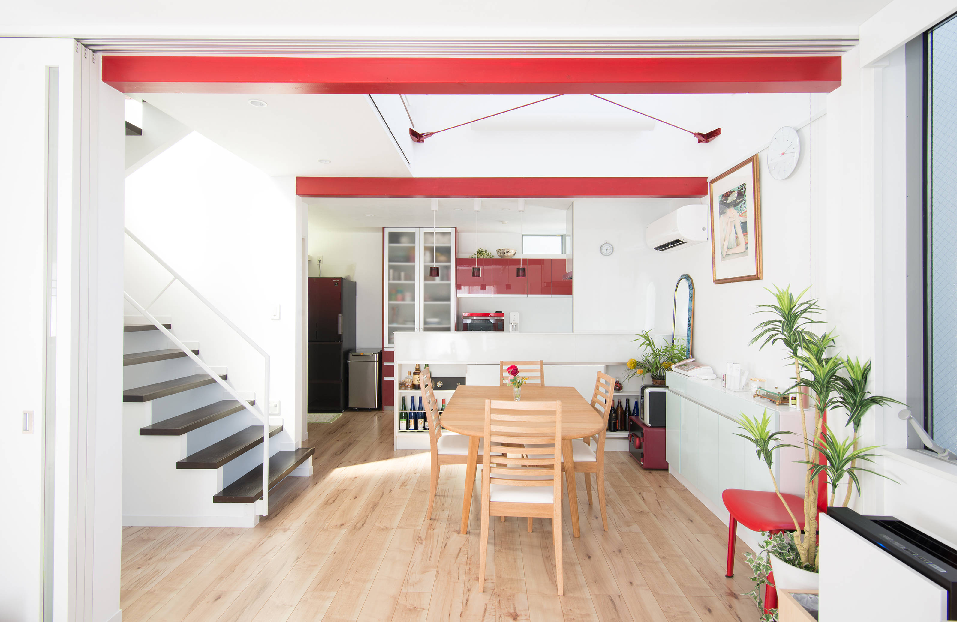 建物は木造3階建てで、狭小地でも狭さを感じさせないよう、吹き抜けを設けたり、高さを多く確保でき開放感のある勾配天井を取り入れています。