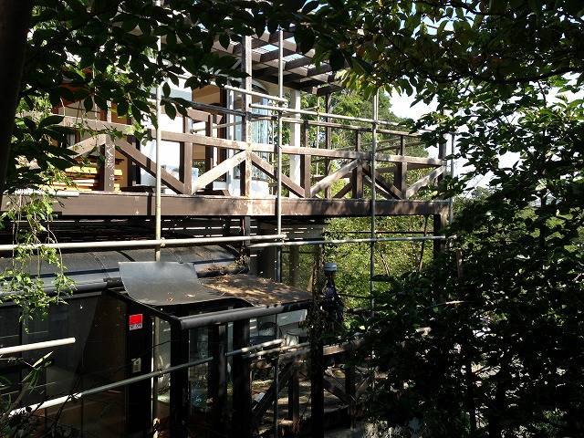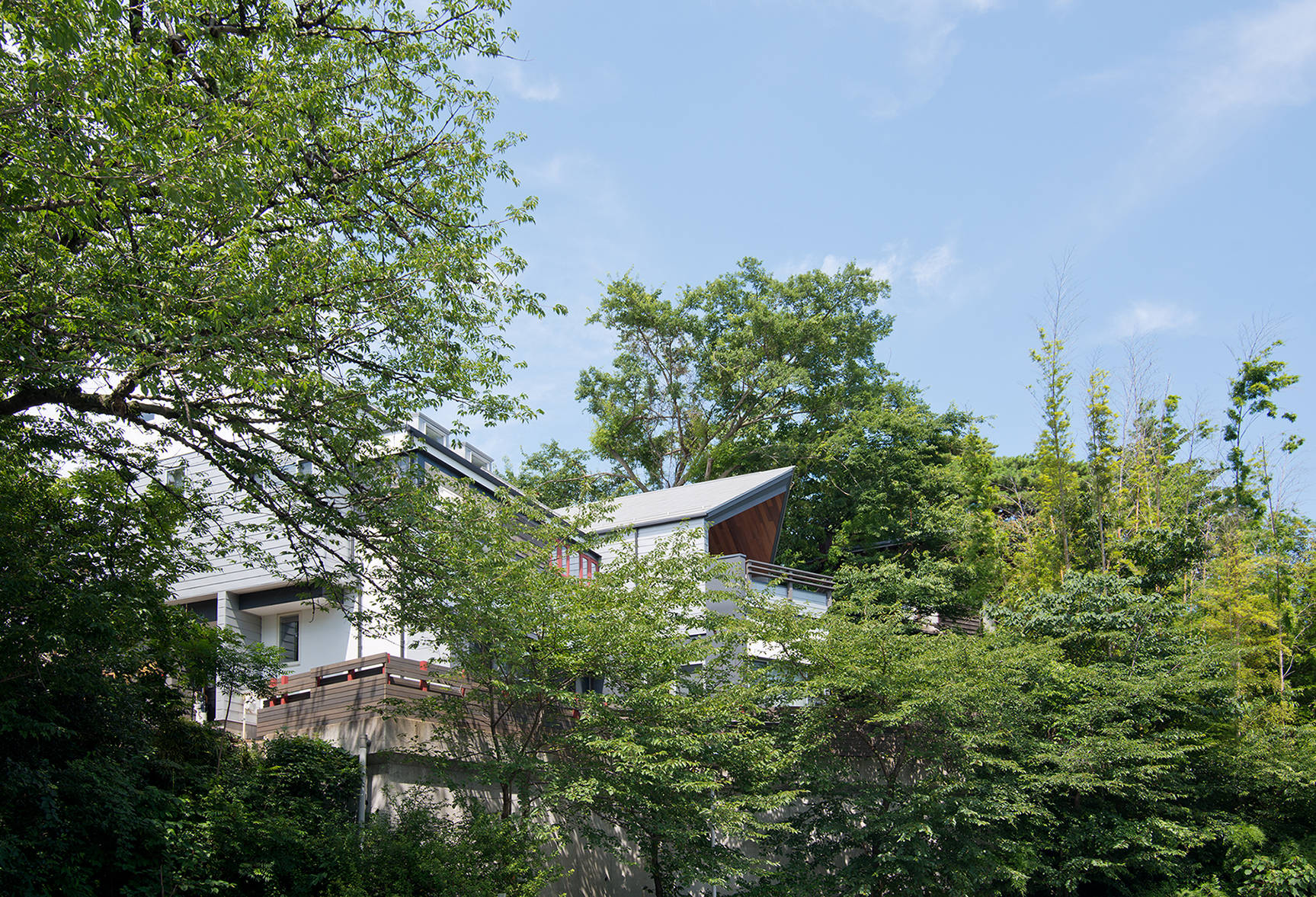 計画敷地は建物の裏が5mほど低くなっているがけ地。不整形地でもあり複雑な形の多角形の土地です。がけ地という土地はコストがかかるというデメリットがありますがそれ以上に景色、日当たりの面でメリットがあります。この土地でもそのメリットを活かしたプランとしており、春になると桜の木が満開になるため家でもお花見ができてしまうほどです。
