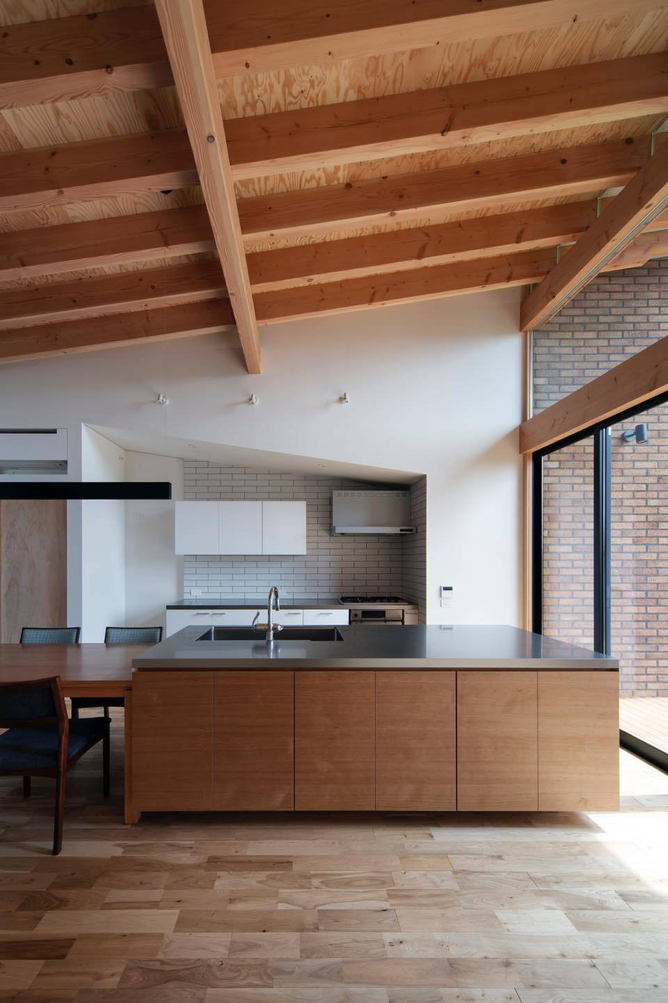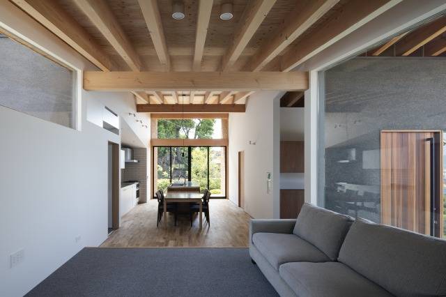 リビングダイニングからは、南側の大開口と西側のポーチ越しに、豊かな緑と眺望を楽しむ事が出来ます。北側の個室は離れに住むご両親が気軽に訪れ易い様に、子供室や和室を配置し、離れを含めた敷地全体での家族の住まい方に配慮しました。
