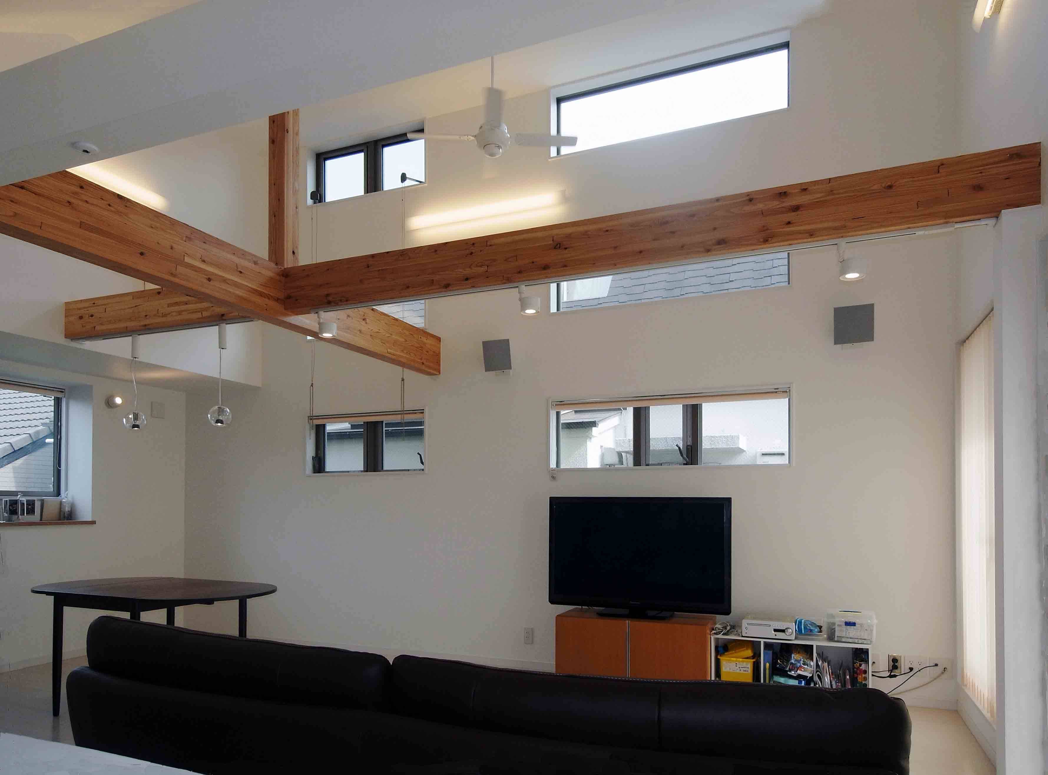 リビングは屋根の形を活かして爽快な勾配天井とし、梁をデザインとしてあえて出しました