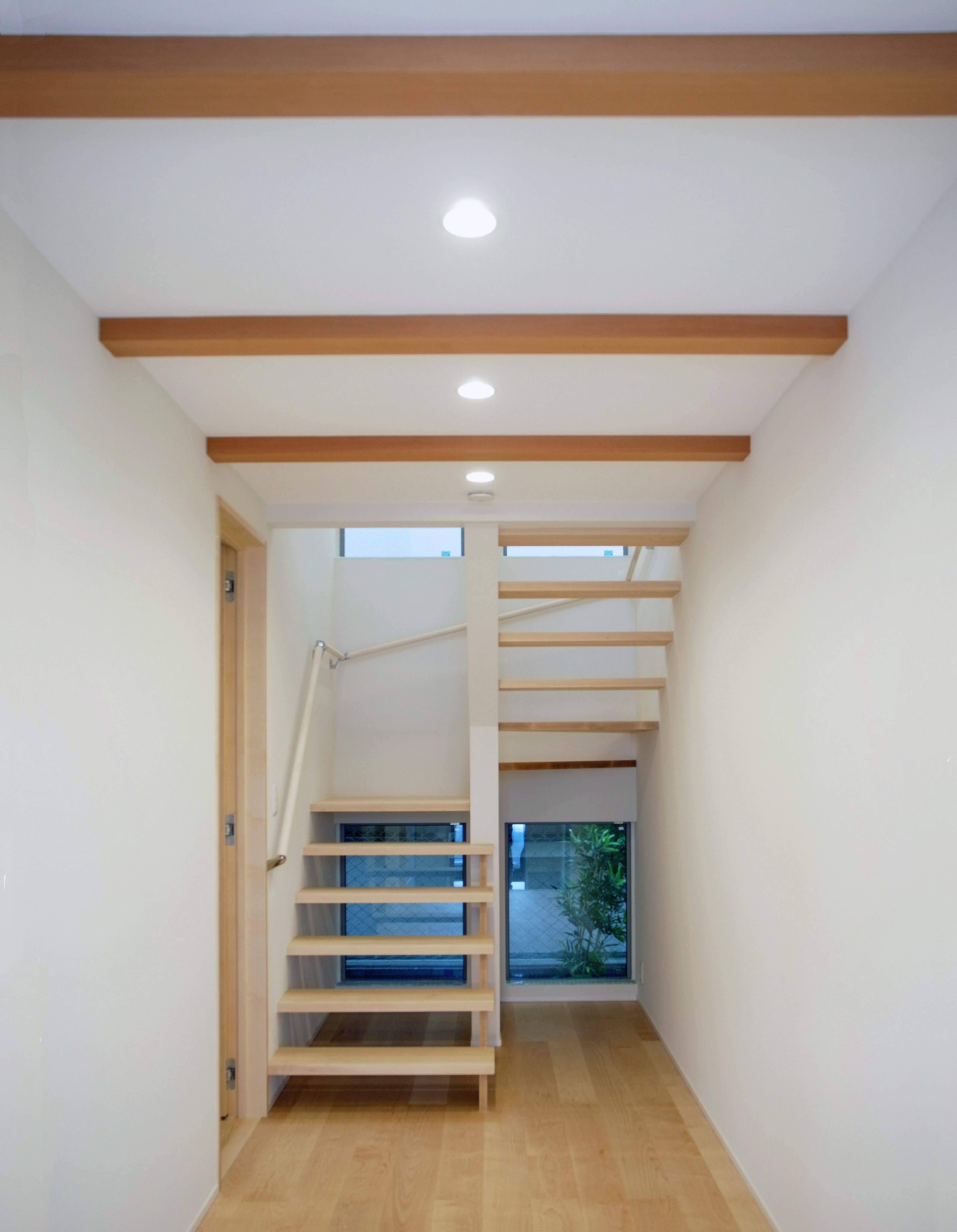 無垢のフローリングとドア、階段が魅力のデザイン住宅です。