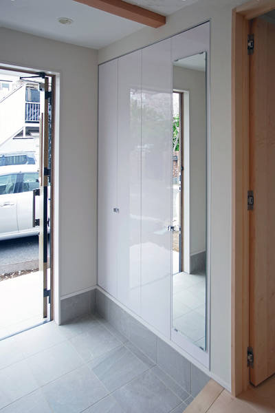 玄関収納も鏡面の面材で造作して、鏡を貼りました