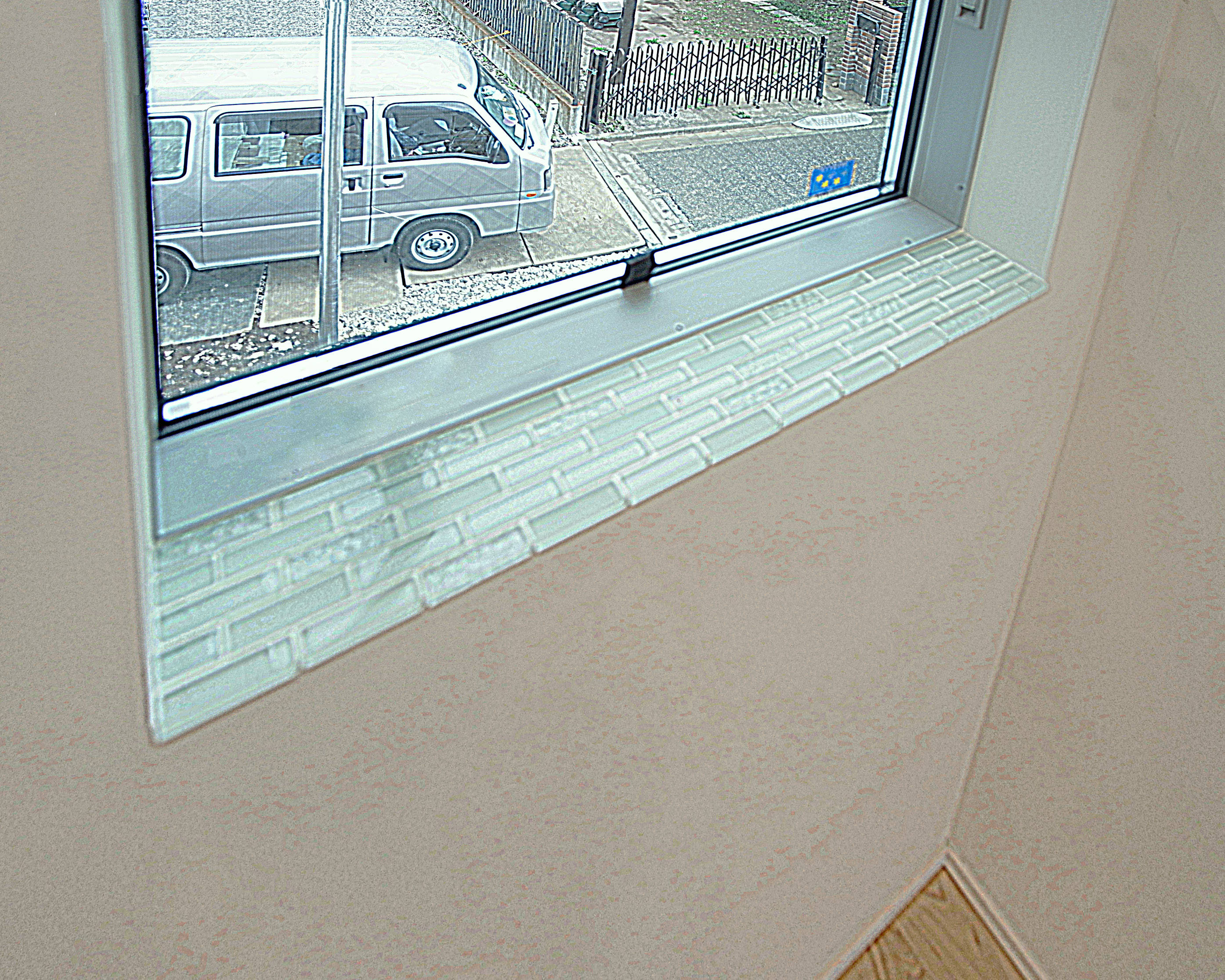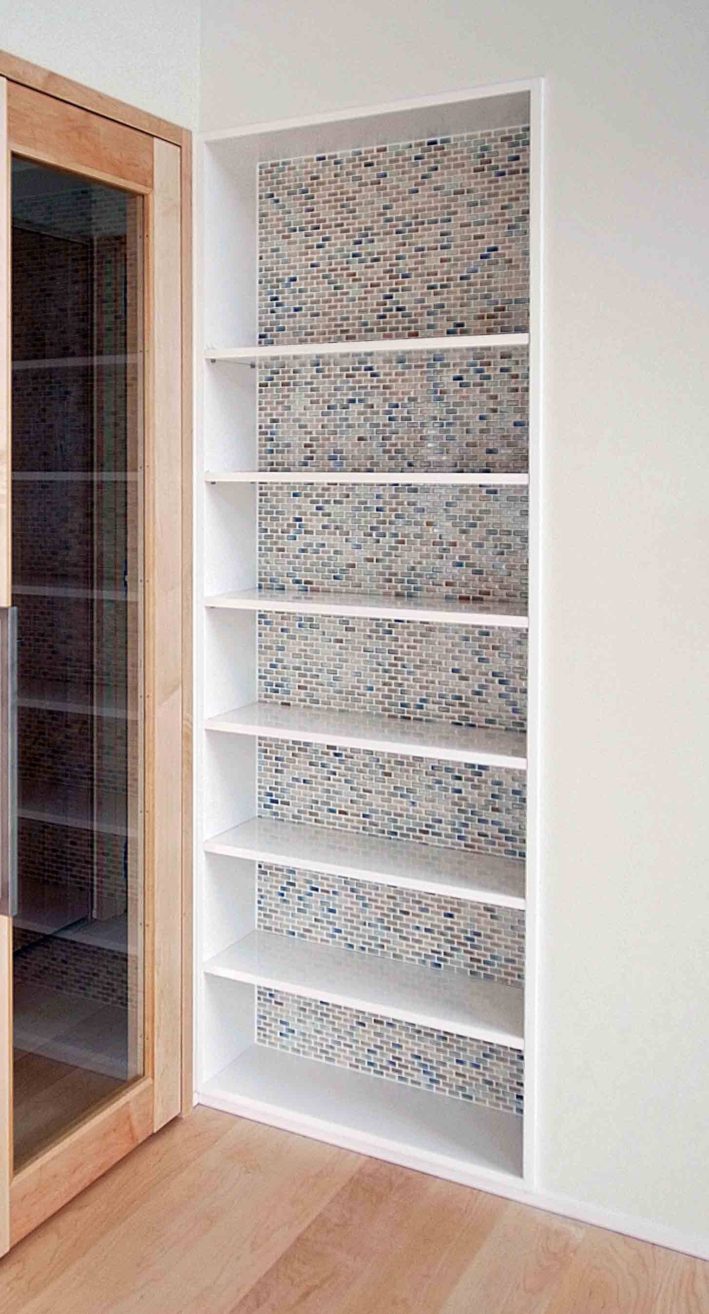 ちょっとしたデッドスペースに飾り棚を設け、奥の面にモザイクタイルを貼ってカフェ風に造作しました