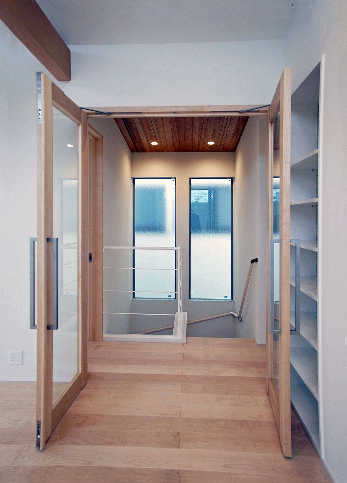 リビング入り口は無垢の量開き戸にして、階段室の天井に羽目板を貼りました
