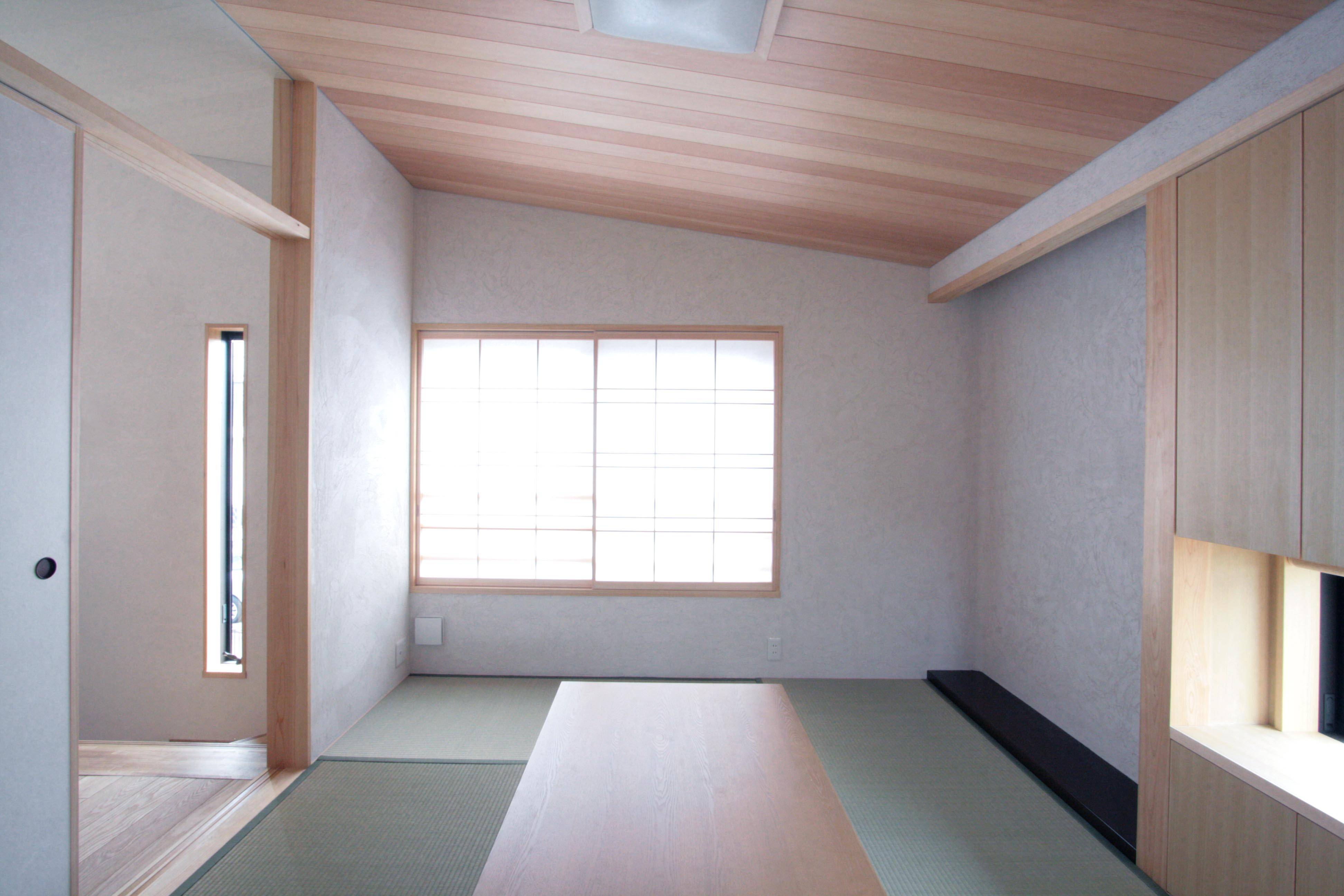 床や造作材はタモや桧材、その他仕上材は石、タイル、漆喰、再生紙、自然塗料といった自然素材を多く使用した家です。