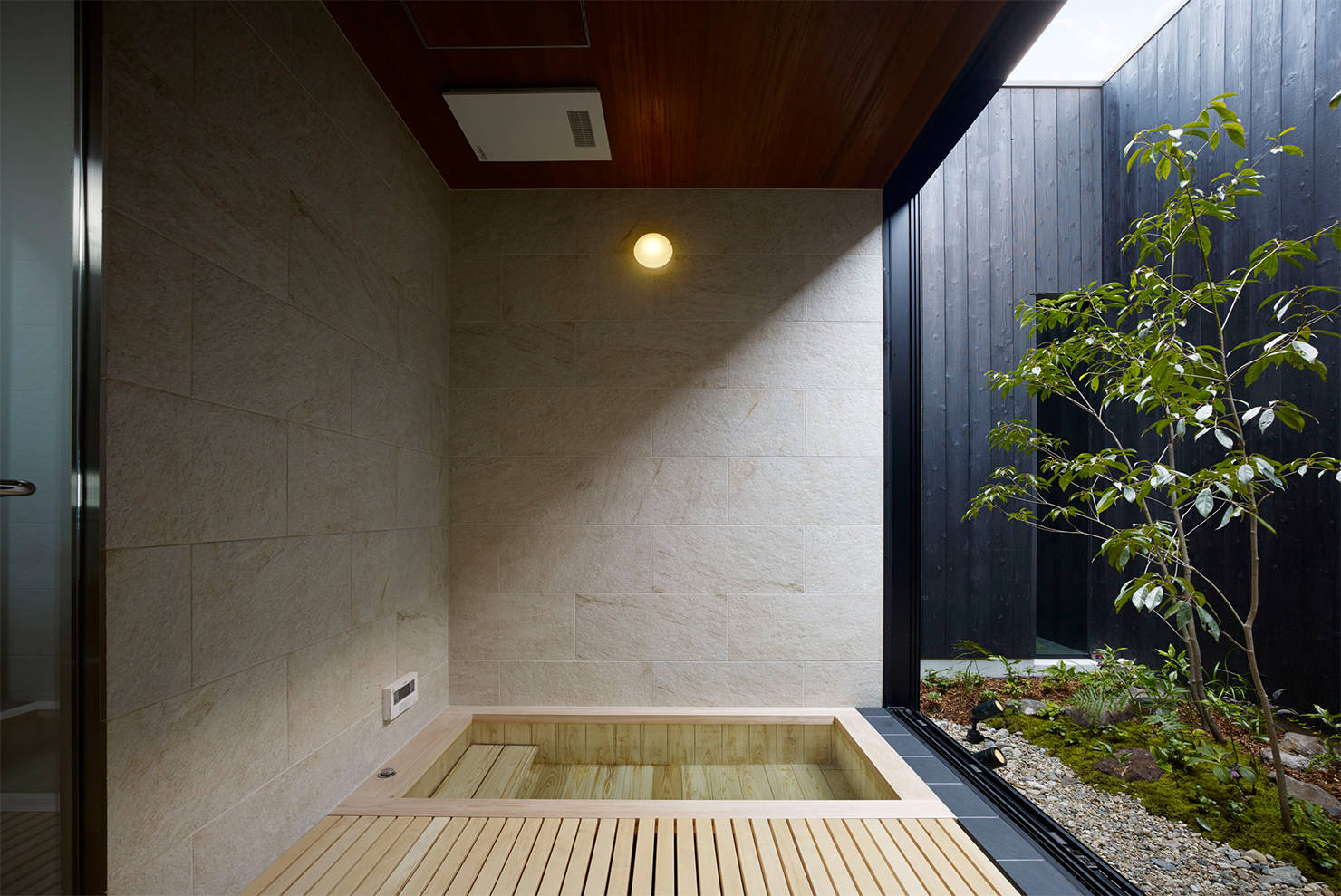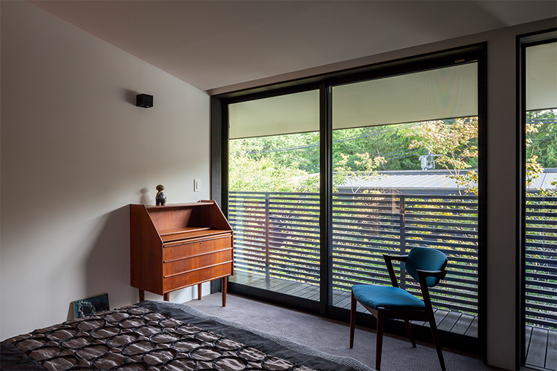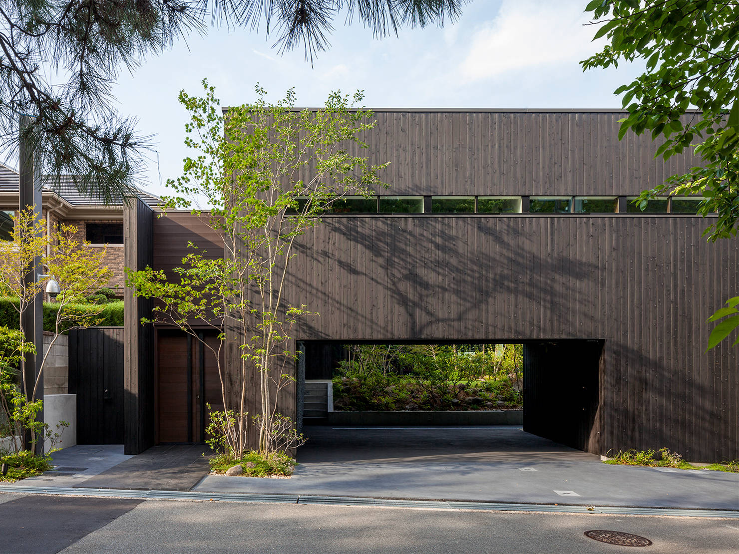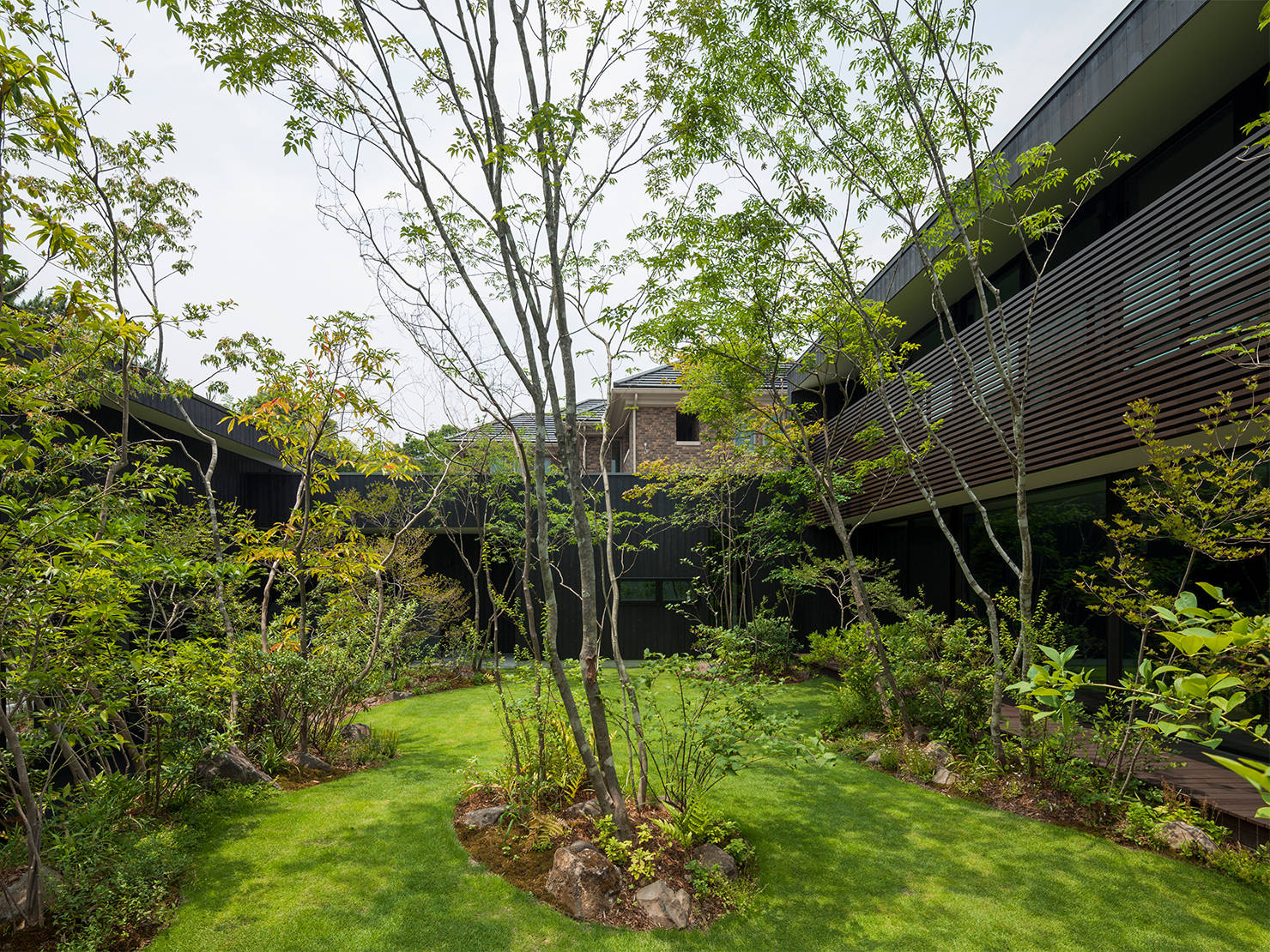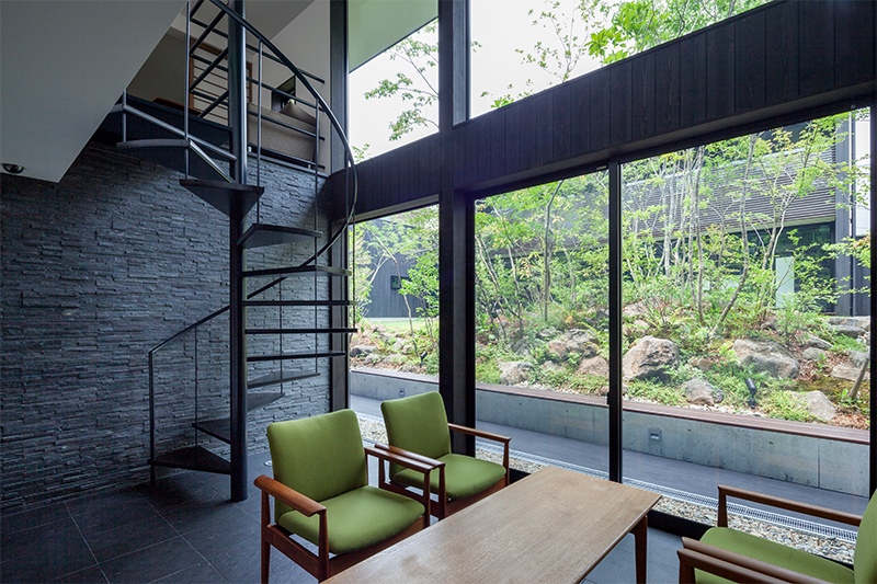 大阪の大きな公園に面する土地に自宅と事務所を併設した計画。前面道路に面する事務所より奥の自宅部分の土地が半階ほど上がっていることから、間に設けた中庭の植栽配置を工夫することでプライバシーを守っている。